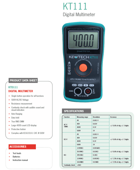 £13.50 + VAT (£16.20)Unit price /UnavailableKewtech KT111 500V TRMS Digital Multimeter