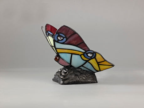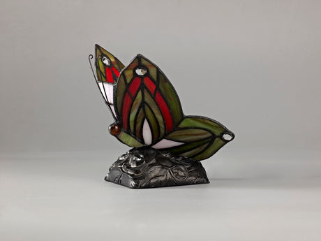 Quinn Tiffany Butterfly Table Lamp, 1 x E14, Black Base With Green/Red Glass With Clear Crystal