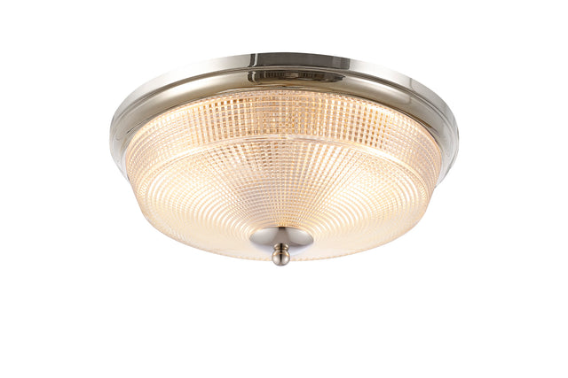 Gordon 2 Light E27 Flush Ceiling Light, IP44, Polished Nickel/Prismatic Glass