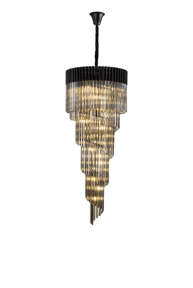 Longhorn 70cm Pendant Round 5 Layer Spiral 23 Light E14, Matt Black / Smoke Sculpted Glass, Item Weight: 57kg is backordered and will ship as soon as it is back in stock.