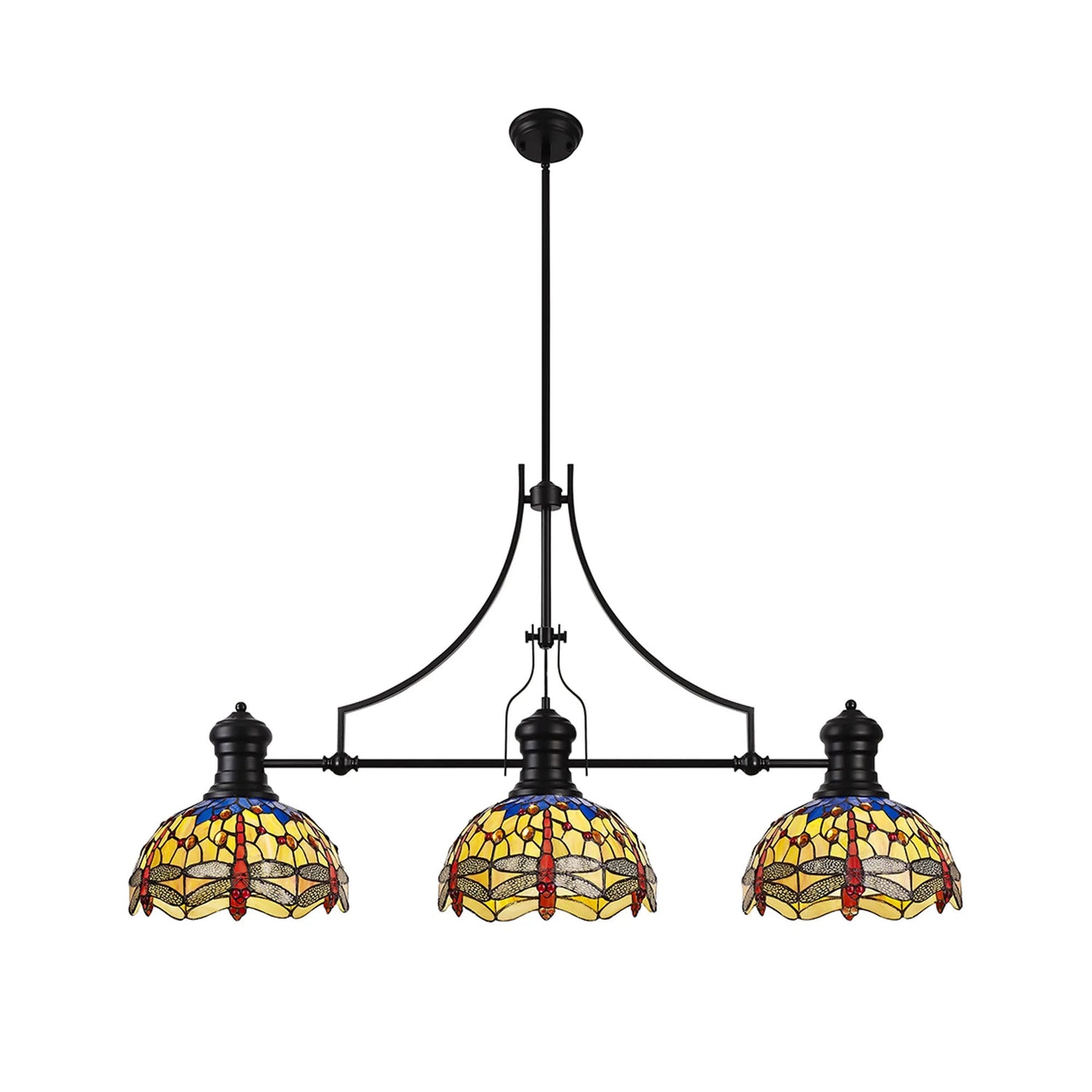Hinnigan 3 Light Linear Pendant E27 With 30cm Tiffany Shade, Matt Black, Blue, Orange, Crystal
