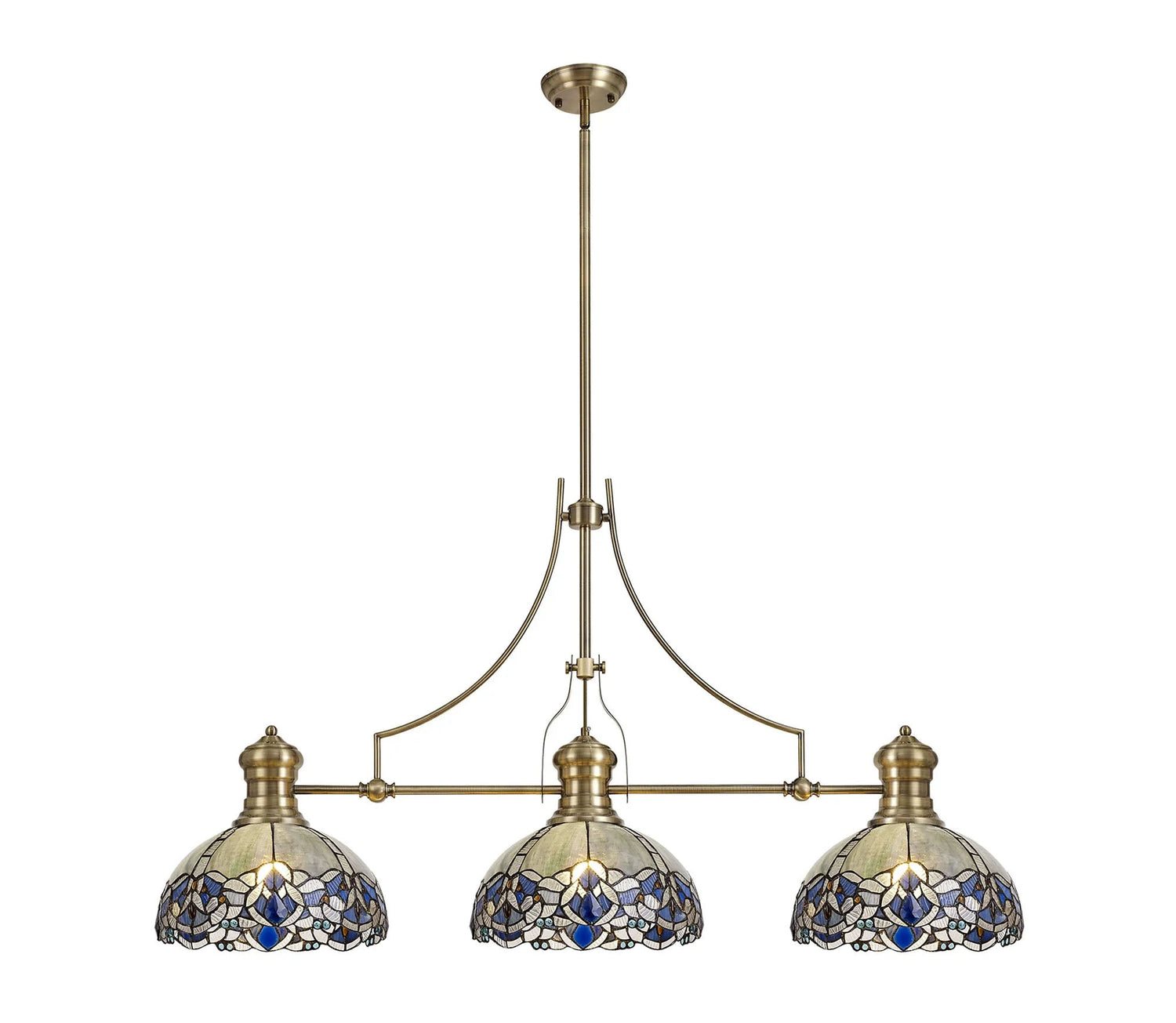 Siddall 3 Light Linear Pendant E27 With 30cm Tiffany Shade, Antique Brass, Blue, Clear Crystal