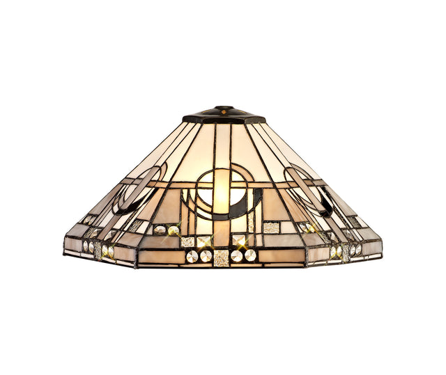 Bould takes its name from the inspiration of its design. The vintage effect of the Tiffany glass is interpreted to reflect Aztecan artistic creations with the shapes and positioning of the glass pieces being furthered by the shape of the shade itself. Giving this range a subtle modern edge the shades are embedded with clear crystal pieces in keeping with the monochrome palette of coloured glass. The Bould range includes two non-electric shades and a 1 light wall lamp.