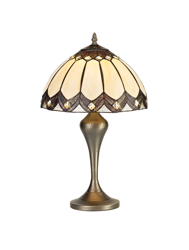 Corner is the epitome of traditional Tiffany glass designs. An aged antique brass table lamp furthers the vintage effect of this product with the decorative applicability of the Corner table lamp elevated by the dome shaped shade comprised of cream and brown Tiffany glass. A touch of sparkle enhances its appeal in the form of high quality clear crystal squares embedded at the point of each feathered pattern.