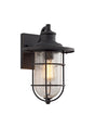 Cox's wall lamp and pendant follow a vintage theme reminiscent of the classic lanterns used on sailing boats. A clear bell shaped glass, formed with small bubbles to replicate fine drops of water, safely houses an E27 lamp holder. The nautical nature of the gridline frame complements the glass feature whilst providing an added defence against outdoor elements. The black colour finish with gold trim also enhances the ranges durability.