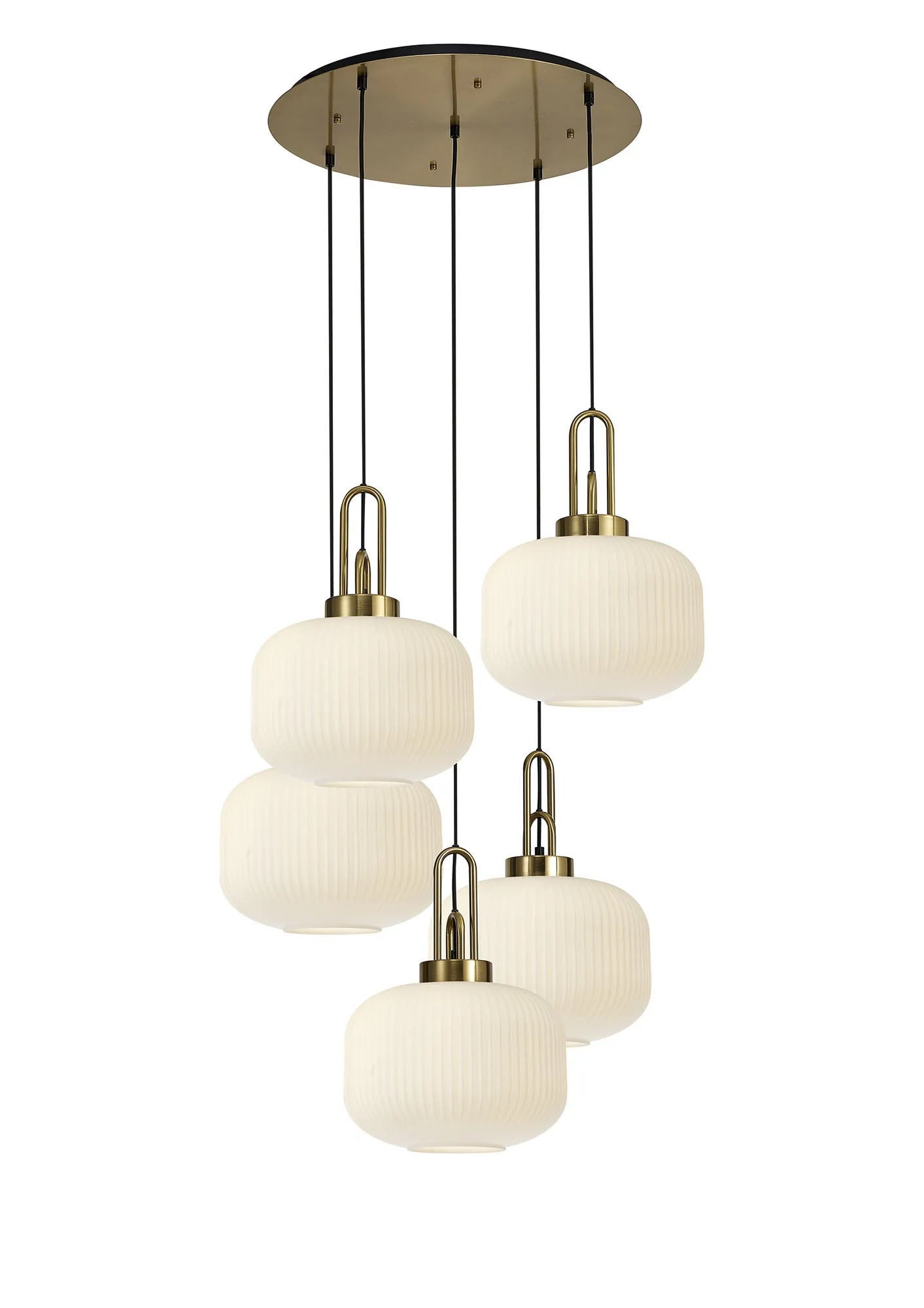 Allardyce 2.5m Round Pendant, 5 x E27, Brass Gold/Matt Black With 30cm Pumpkin Shaped Ribbed Opal Glass