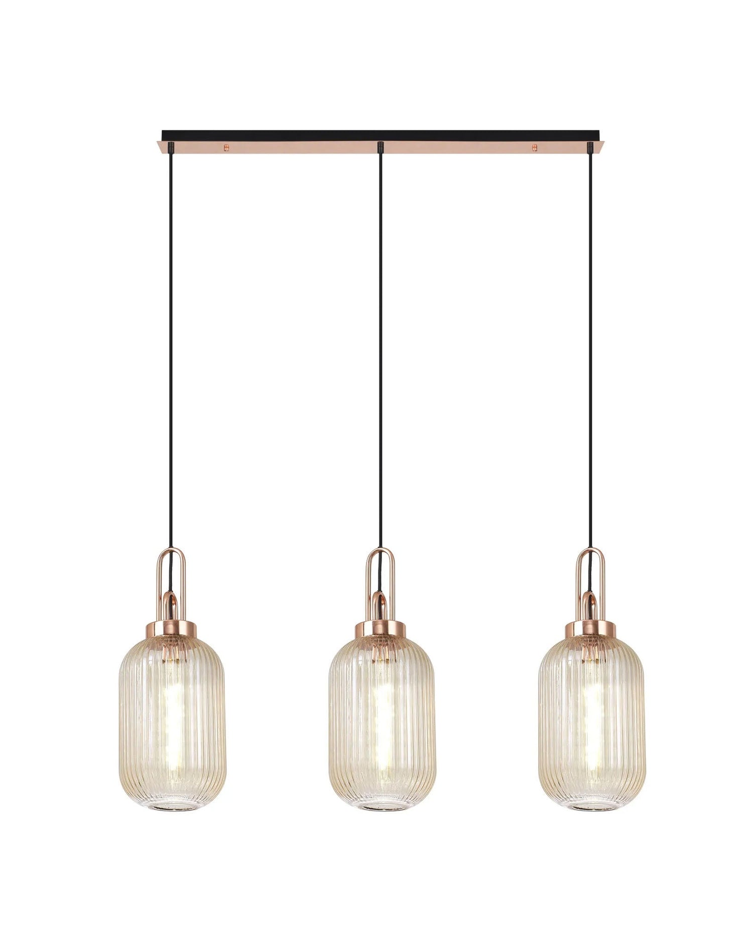 Allardyce Linear 3 Light Pendant E27 With 20cm Tubular Ribbed Glass, Champagne Copper/Matt Black