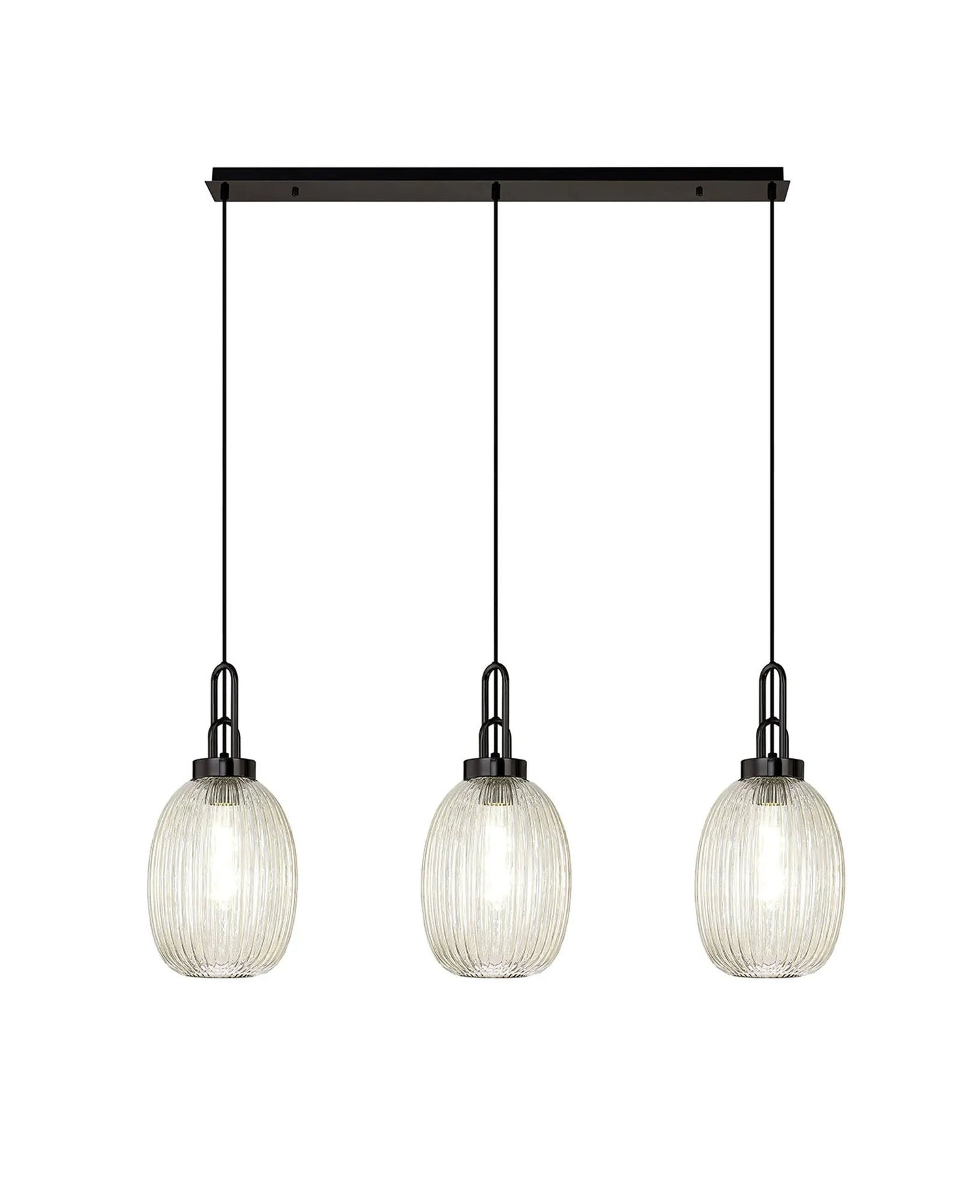 Allardyce Linear 3 Light Pendant With 20cm Almond Ribbed Glass, Black Chrome/Matt Black Champagne