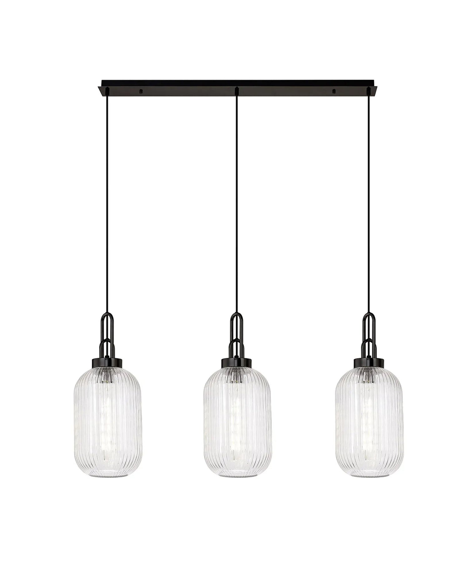 Allardyce Linear 3 Light Pendant With 20cm Tubular Ribbed Glass, Black Chrome/Matt Black Clear