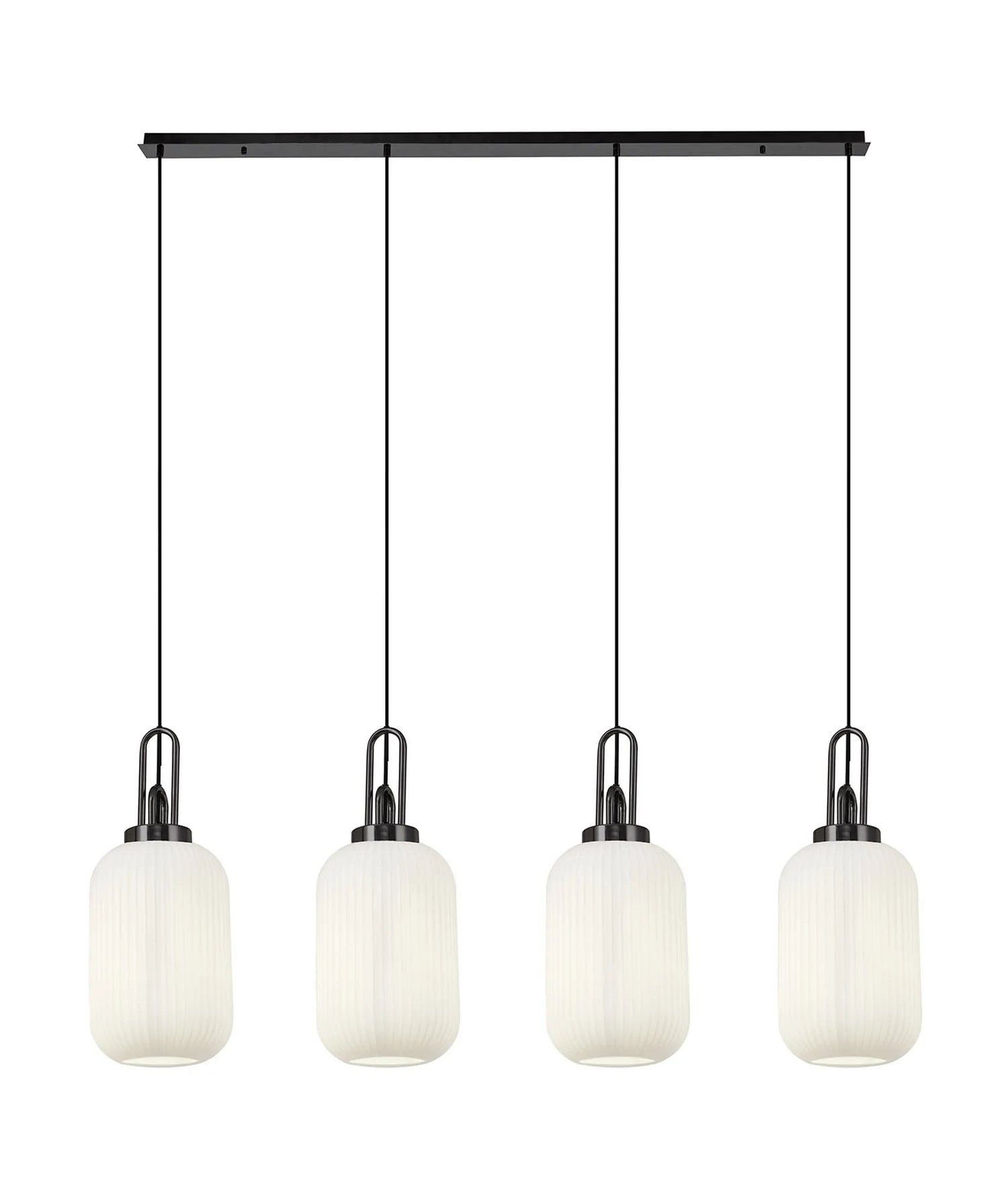 Allardyce Linear 4 Light Pendant With 20cm Tubular Ribbed Glass, Black Chrome/Matt Black Opal