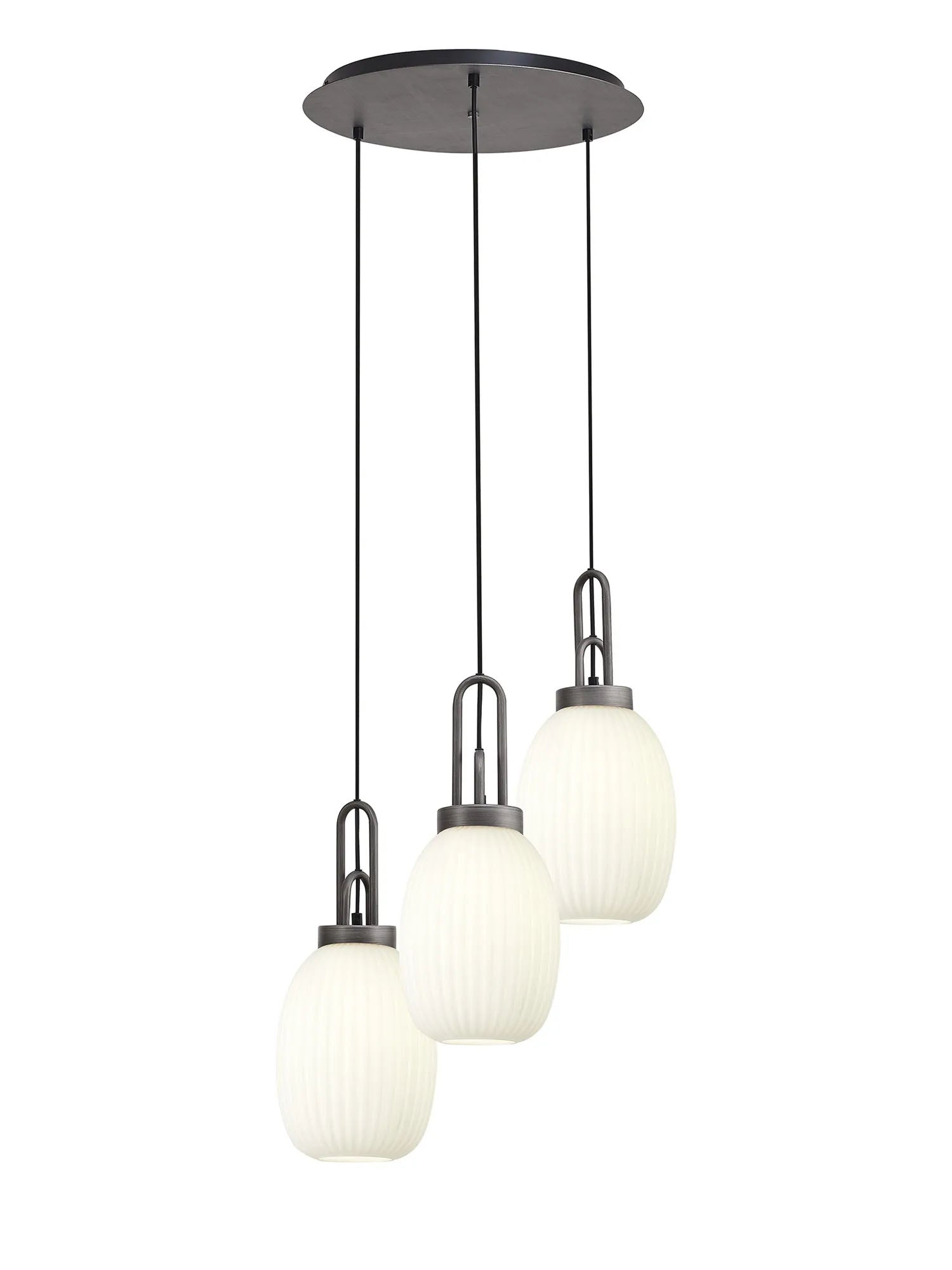 Allardyce Round 3 Light Pendant With 20cm Almond Ribbed Glass, Aged Pewter/Matt Black Opal