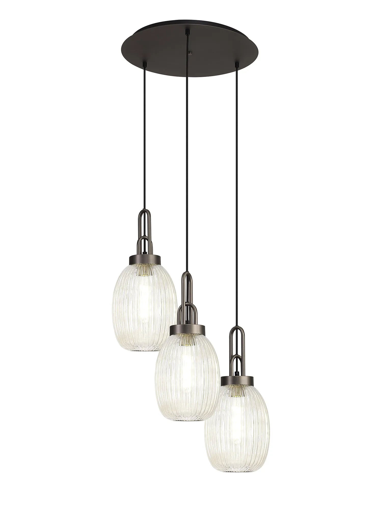 Allardyce Round 3 Light Pendant With 20cm Almond Ribbed Glass, Antique Silver/Matt Black Champagne