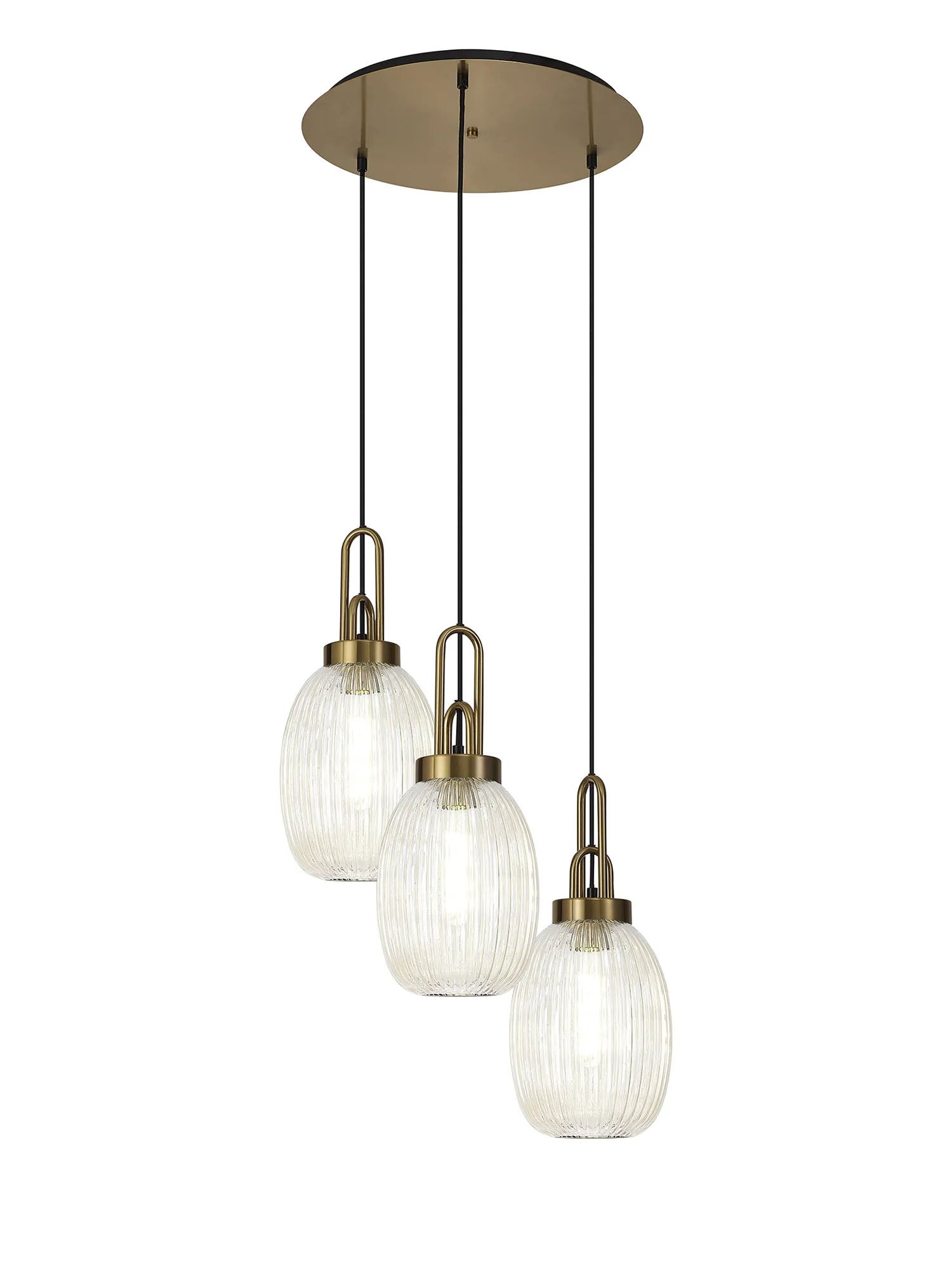 Allardyce Round 3 Light Pendant With 20cm Almond Ribbed Glass, Brass Gold/Matt Black Champagne