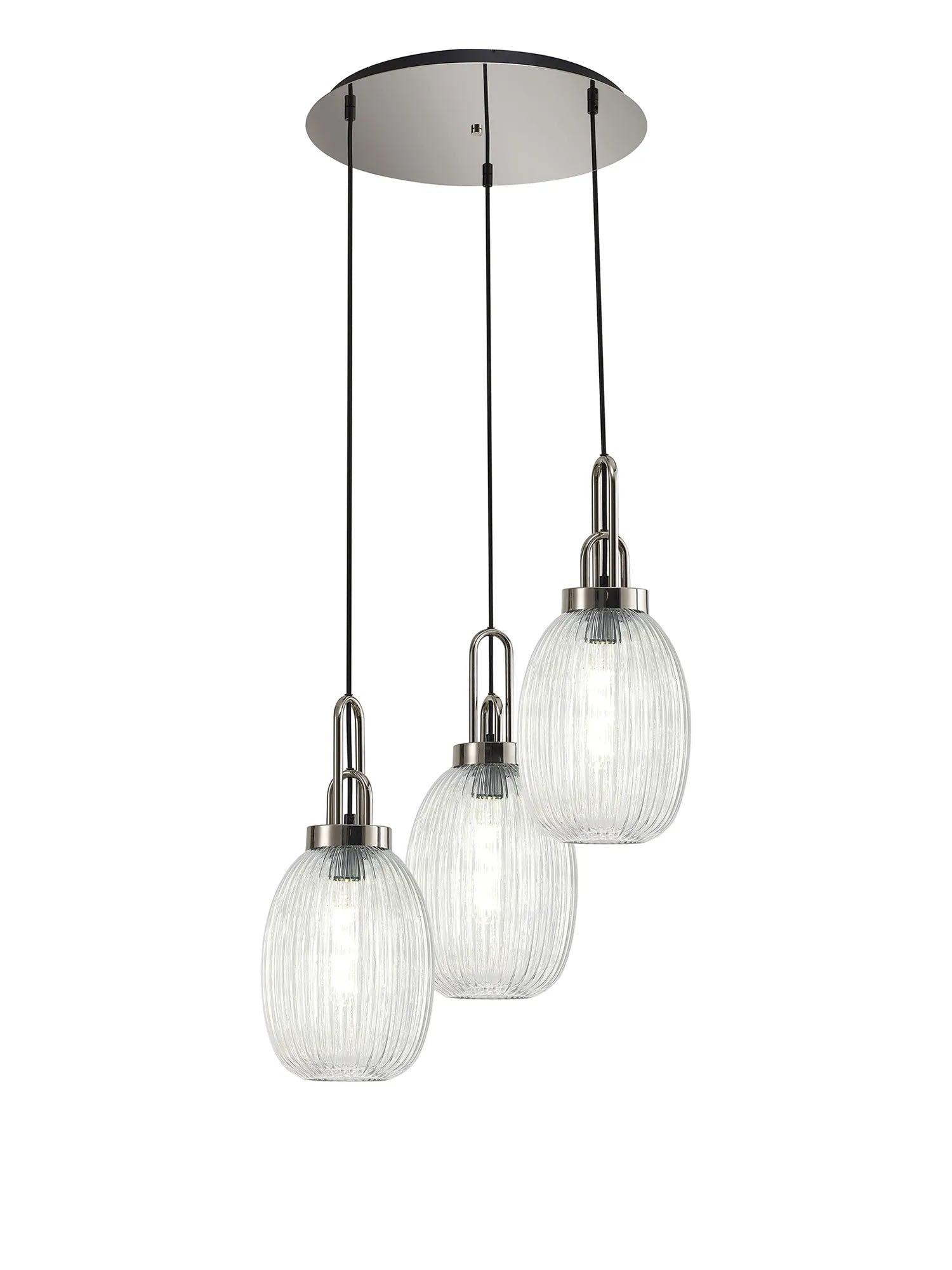 Allardyce Round 3 Light Pendant With 20cm Almond Ribbed Glass, Polished Nickel/Matt Black Clear