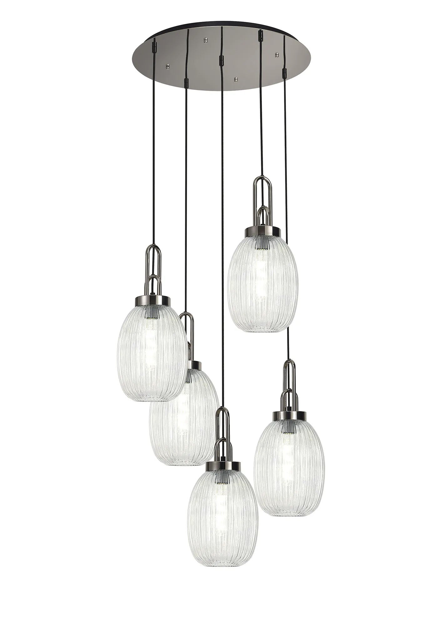 Allardyce Round 5 Light Pendant With 20cm Almond Ribbed Glass, Polished Nickel/Matt Black Clear