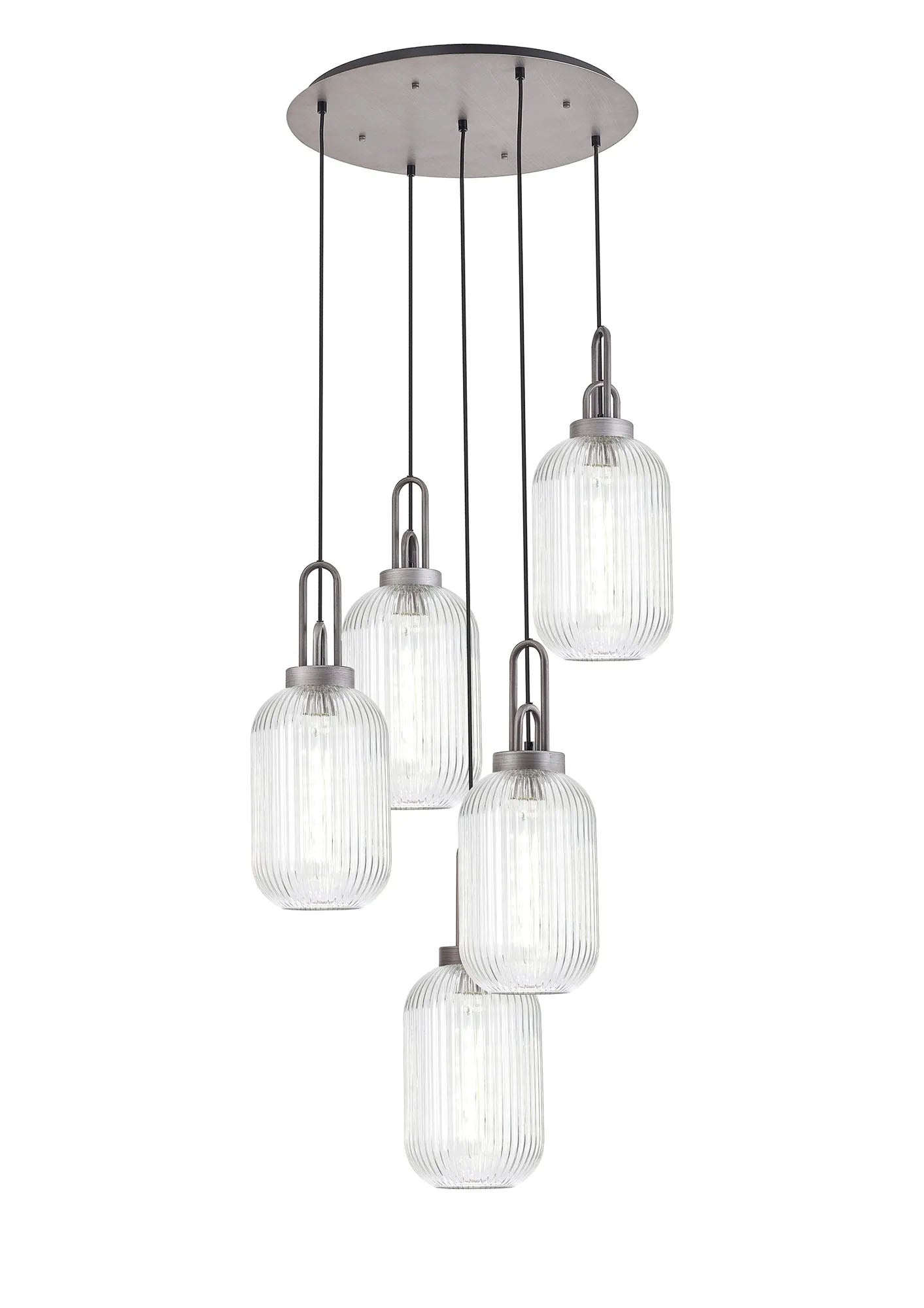 Allardyce Round 5 Light Pendant With 20cm Tubular Ribbed Glass, Aged Pewter/Matt Black Clear