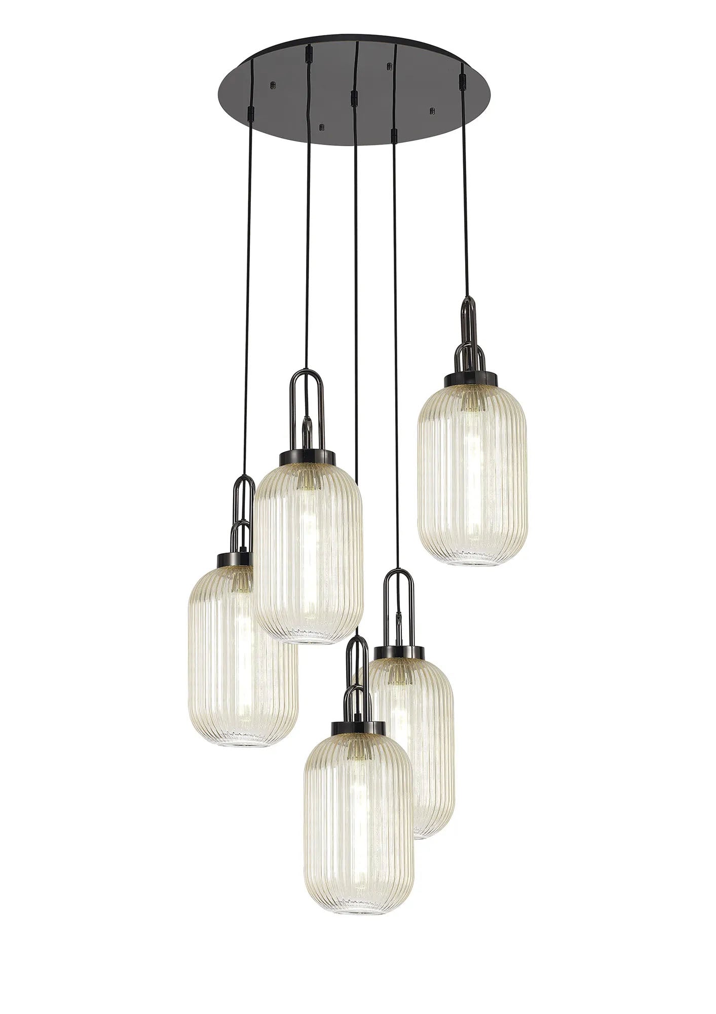 Allardyce Round 5 Light Pendant With 20cm Tubular Ribbed Glass, Black Chrome/Matt Black Champagne