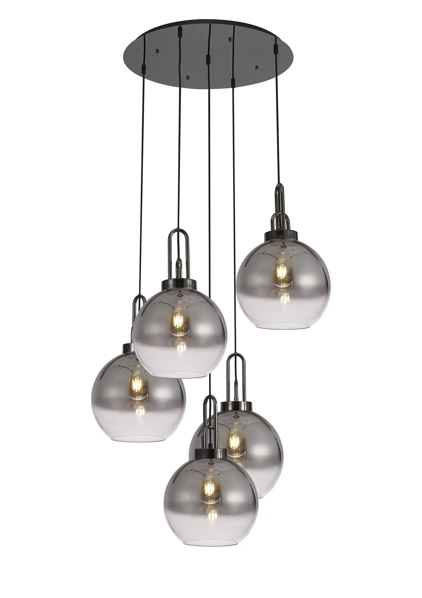 Allardyce Round 5 Light Pendant With 30cm Globe Glass, Black Chrome/Matt Black Smoked/Clear