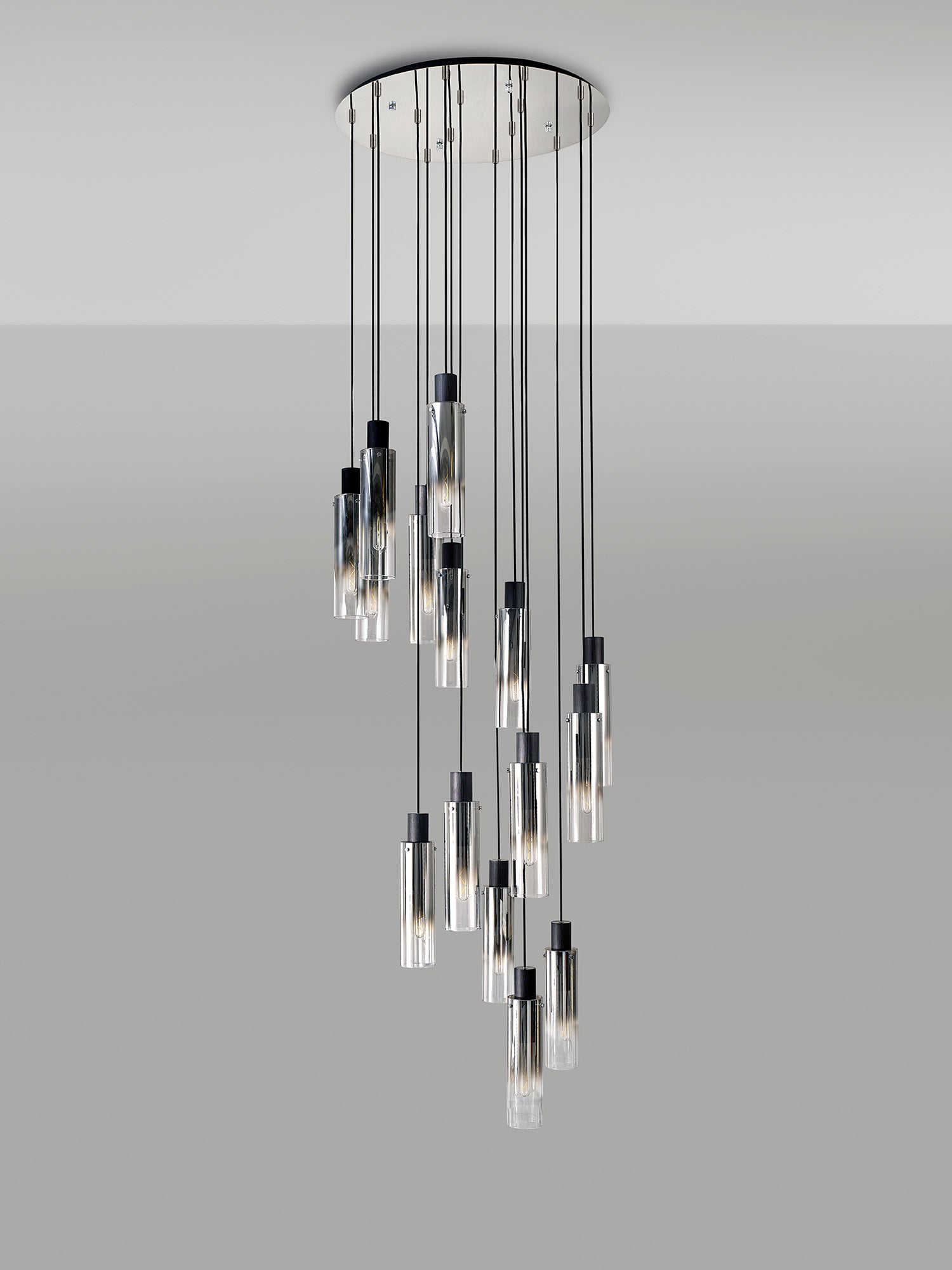 Bridges Round Pendant, 15 Light Adjustable E27, Black/Smoke Fade Glass, Item Weight: 25.3kg is backordered and will ship as soon as it is back in stock.