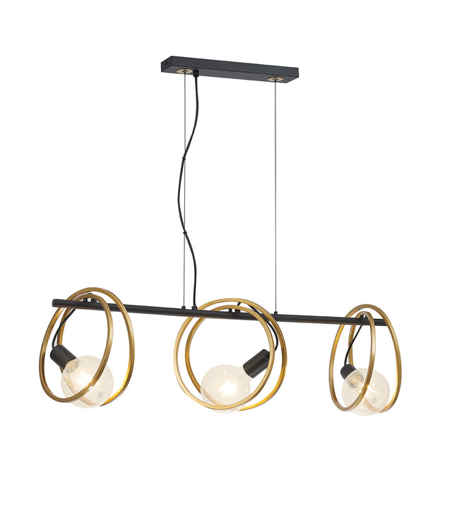 Kay Double Ring Linear Pendant, 3 Light E27, Matt Black / Painted Gold, G95/120 Lamp Recommended