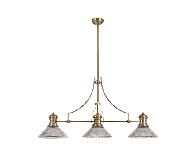 Munro 3 Light Linear Pendant E27 With 30cm Cone Glass Shade, Antique Brass, Clear