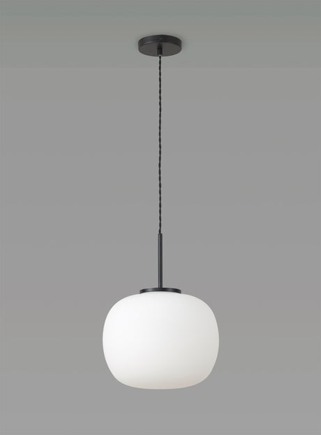 £100.00 + VAT (£120.00)Unit price /Unavailable Cunnington Small Oval Ball Pendant 1 Light E27 Matt Black Suspension With Frosted White Glass Globe