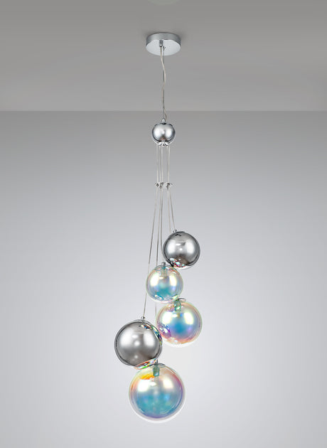 £341.67 + VAT (£410.00)Unit price /UnavailableVery low stock (5 units)Suggett Pendant, 5 x G9, Polished Chrome/Iridescent Glass