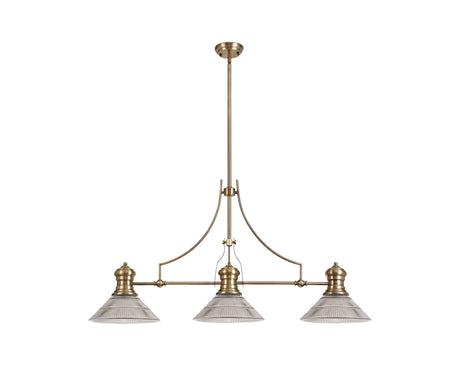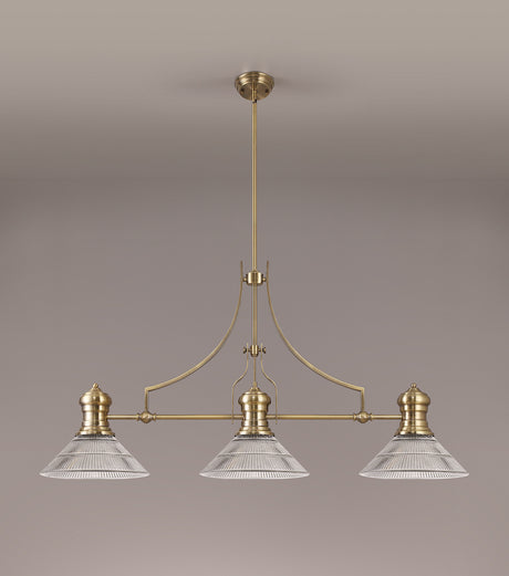 £13.50 + VAT (£16.20)Unit price /UnavailableMunro 3 Light Linear Pendant E27 With 30cm Cone Glass Shade, Antique Brass, Clear