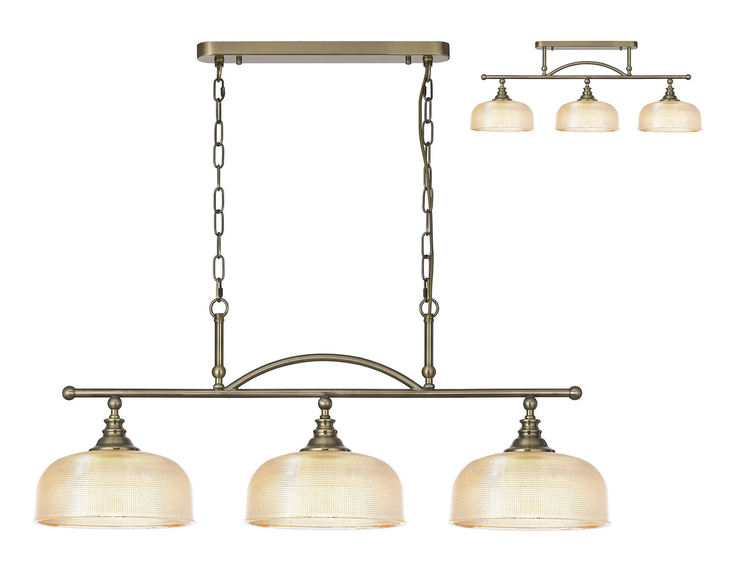Gray Semi Flush/Pendant Bar, 3 Light Adjustable E27, Antique Brass/Amber Glass