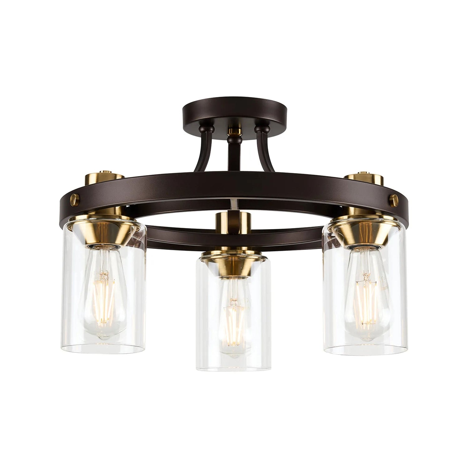 Owers Round Semi Flush Ceiling 3 x E27, Brown Oxide/Gold Bronze With Clear Glass Shades
