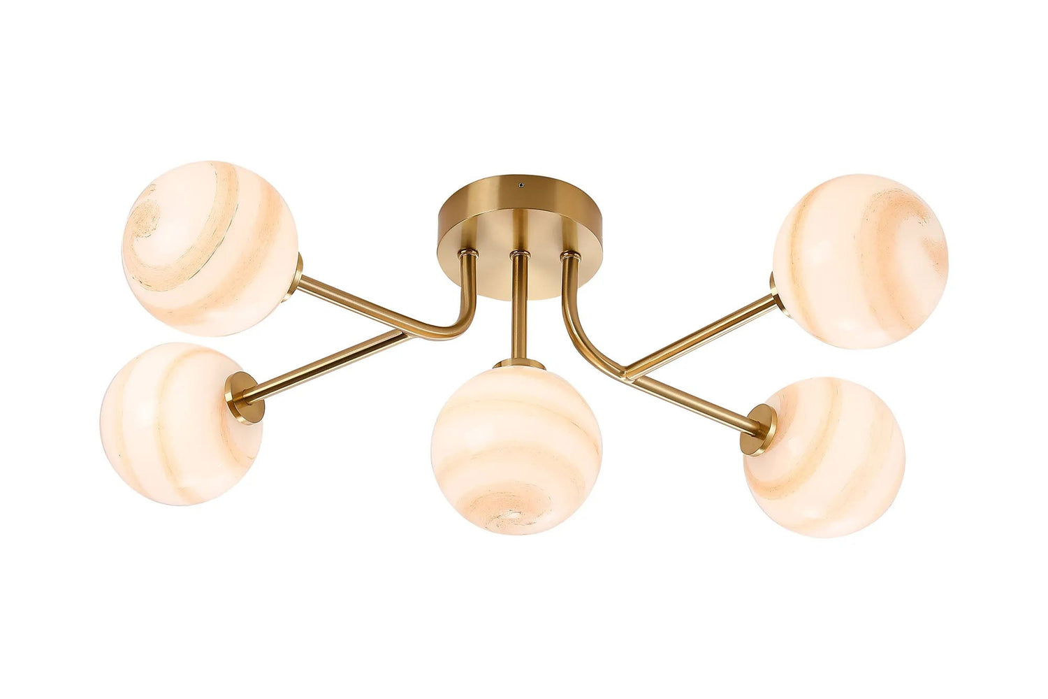 Whitley Linear Semi Flush Ceiling 5 Light IP44 Brass gold/Brown Round Marble Effect Glass