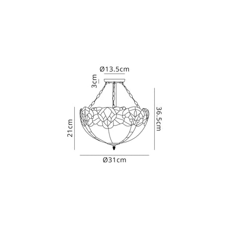 Williams 3 Light Semi Flush E27 With 40cm Tiffany Shade, Green/Cream/Crystal/Aged Antique Brass