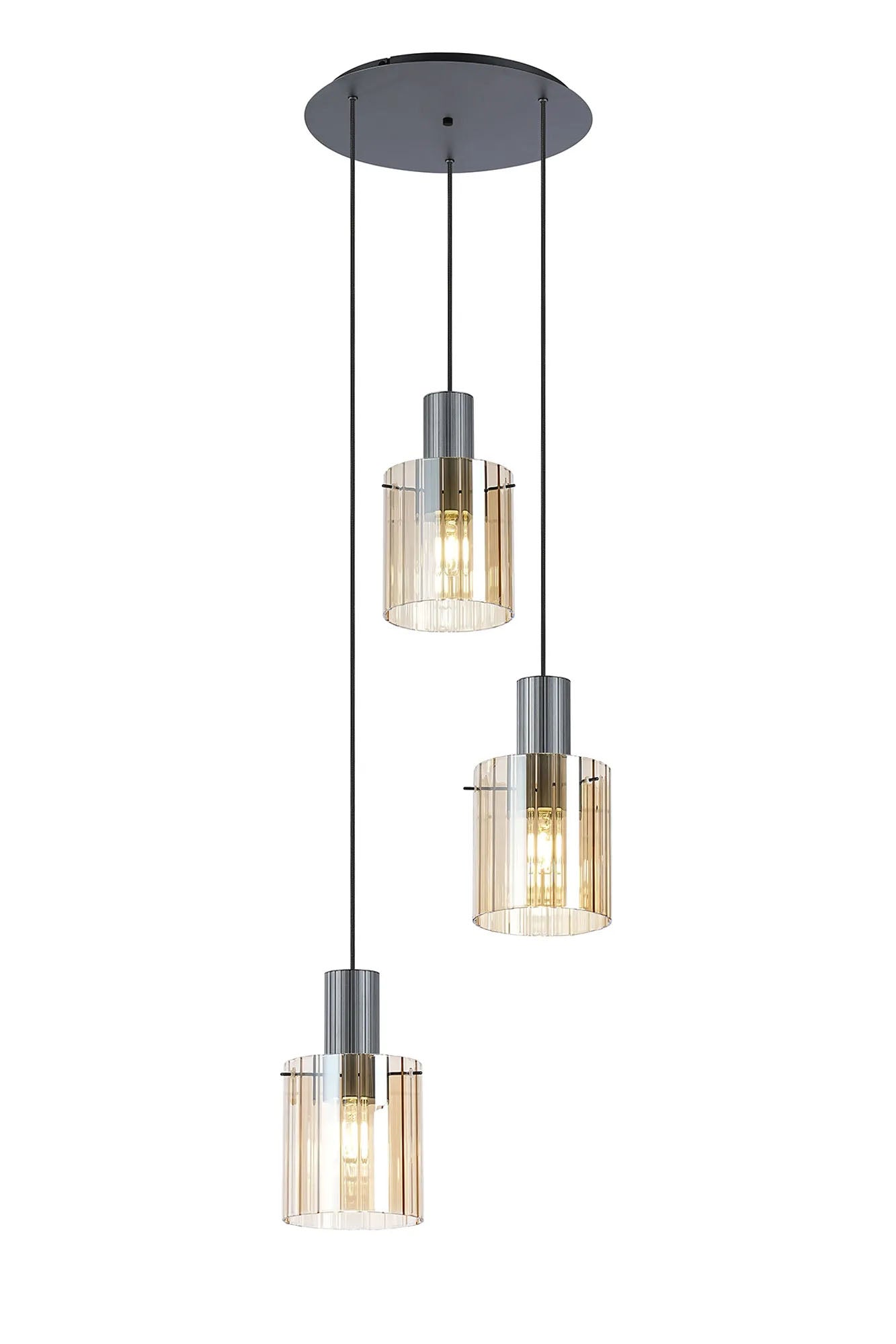 Aouchiche Round Pendant, 3 Light Adjustable E27, Dark Grey/Amber Wide Line Glass