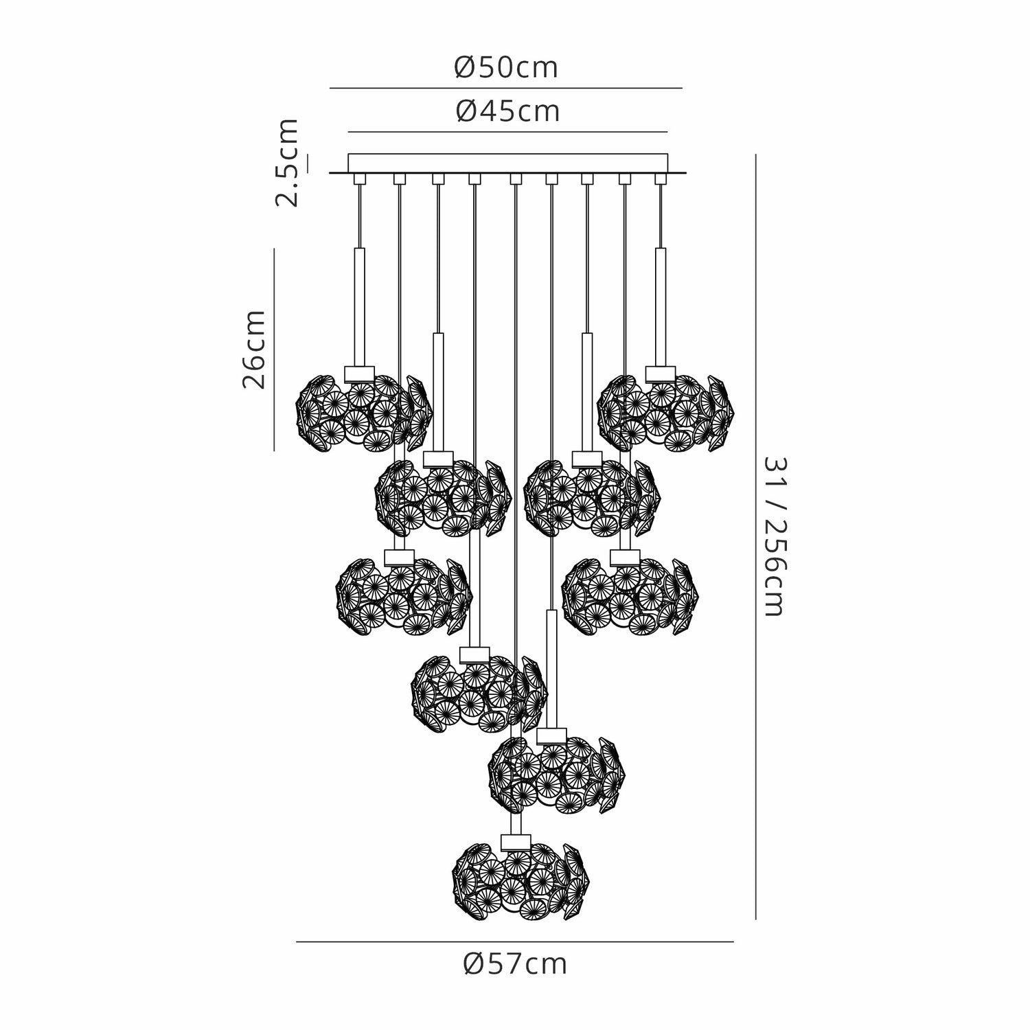 This beautiful comprehensive collection available in either a polished chrome or french gold colour finish, uses slim stems angled erratically to form an enchanting cluster of clear crystal disks. The lines of the central framework of round, tiered and oblong Linear pendants, act as a base from which the crystals can sit around the G9 lampholders ensuring the light emitted from the chosen lamp refracts through each facette throwing sublime spectrums. An even more extensive range of products are now available within the massively popular Byrne range including wall, table and floor lamps, ceiling lights and spectacular spherical pendants with diameters as large as 1.5 metres.