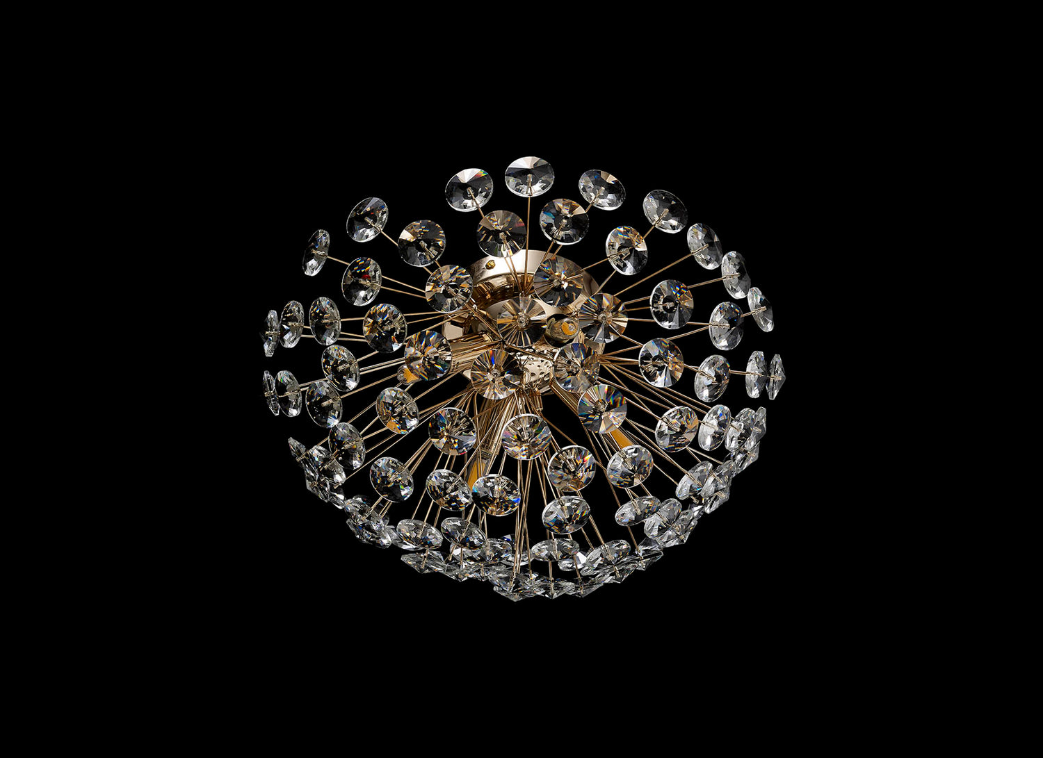 This beautiful comprehensive collection available in either a polished chrome or french gold colour finish, uses slim stems angled erratically to form an enchanting cluster of clear crystal disks. The lines of the central framework of round, tiered and oblong Linear pendants, act as a base from which the crystals can sit around the G9 lamp holders ensuring the light emitted from the chosen lamp refracts through each facette throwing sublime spectrums. An even more extensive range of products are now available within the massively popular Byrne range including wall, table and floor lamps, ceiling lights and spectacular spherical pendants with diameters as large as 1.5 metres.