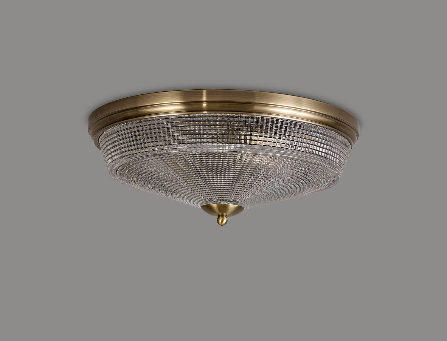 Gray 3 Light E27 Flush Ceiling Light, Antique Brass / Prismatic Glass