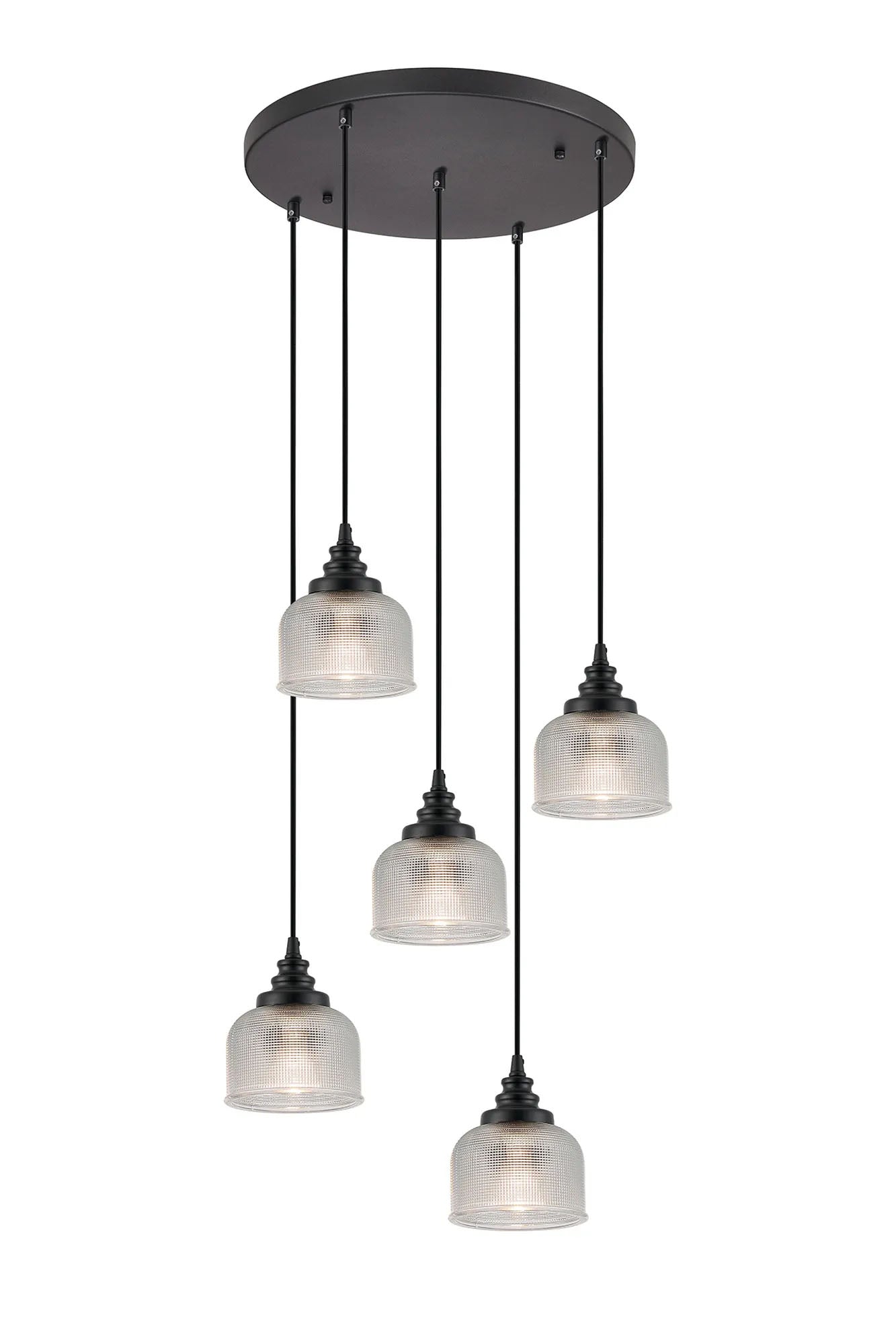 Gray 5 Light Round Pendant, E27, Satin Black/Prismatic Dome Glass, Clear