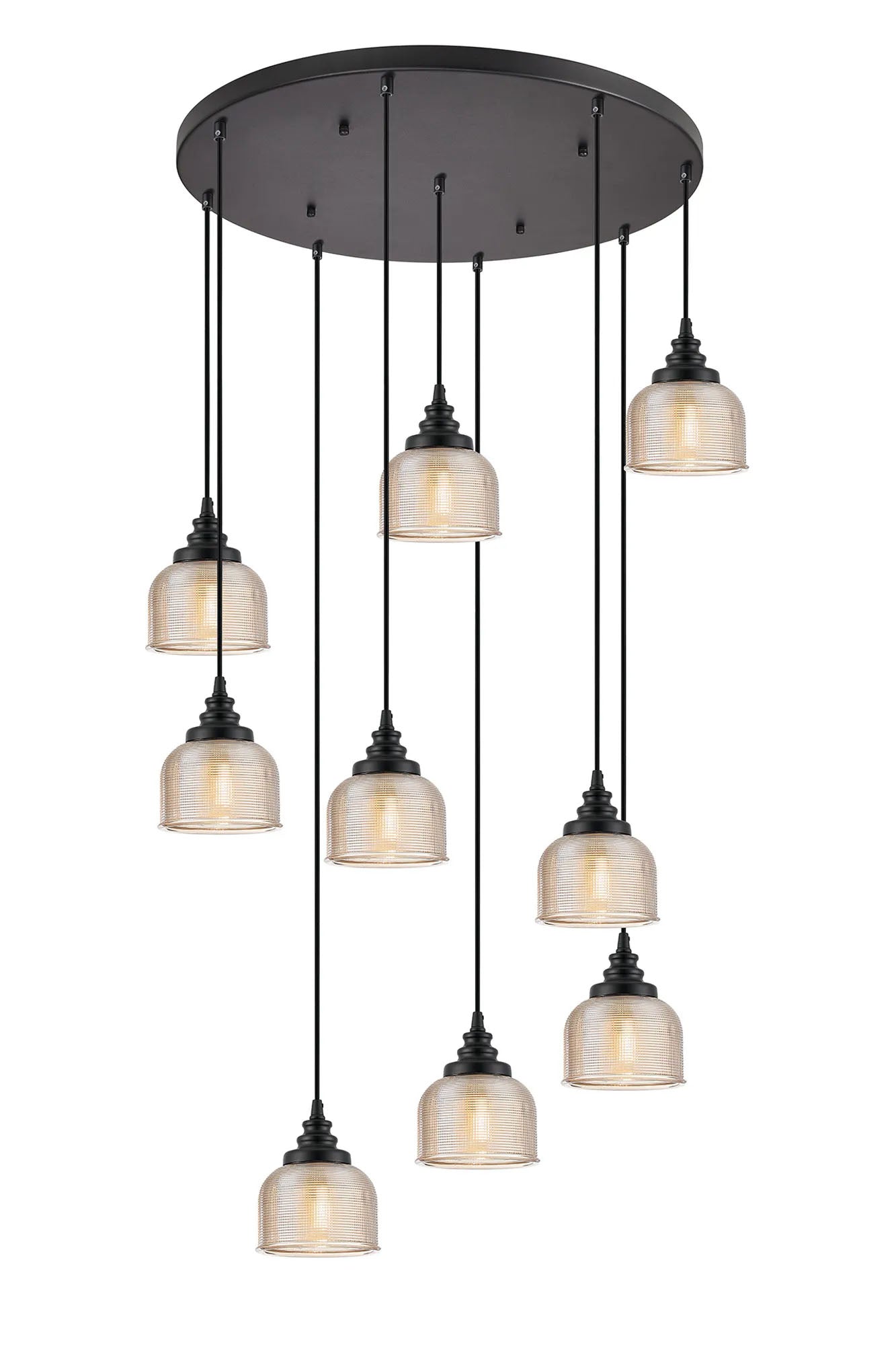Gray 9 Light Round Pendant, E27, Satin Black/Prismatic Dome Glass, Amber