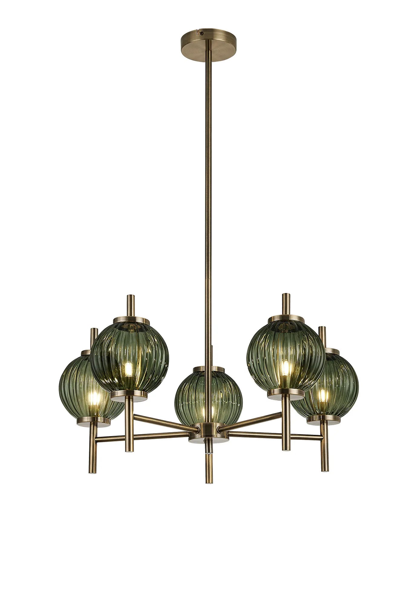 Halom 65cm Multi Height Pendant, 5 x G9, Antique Brass/Moss Green Glass is backordered and will ship as soon as it is back in stock.