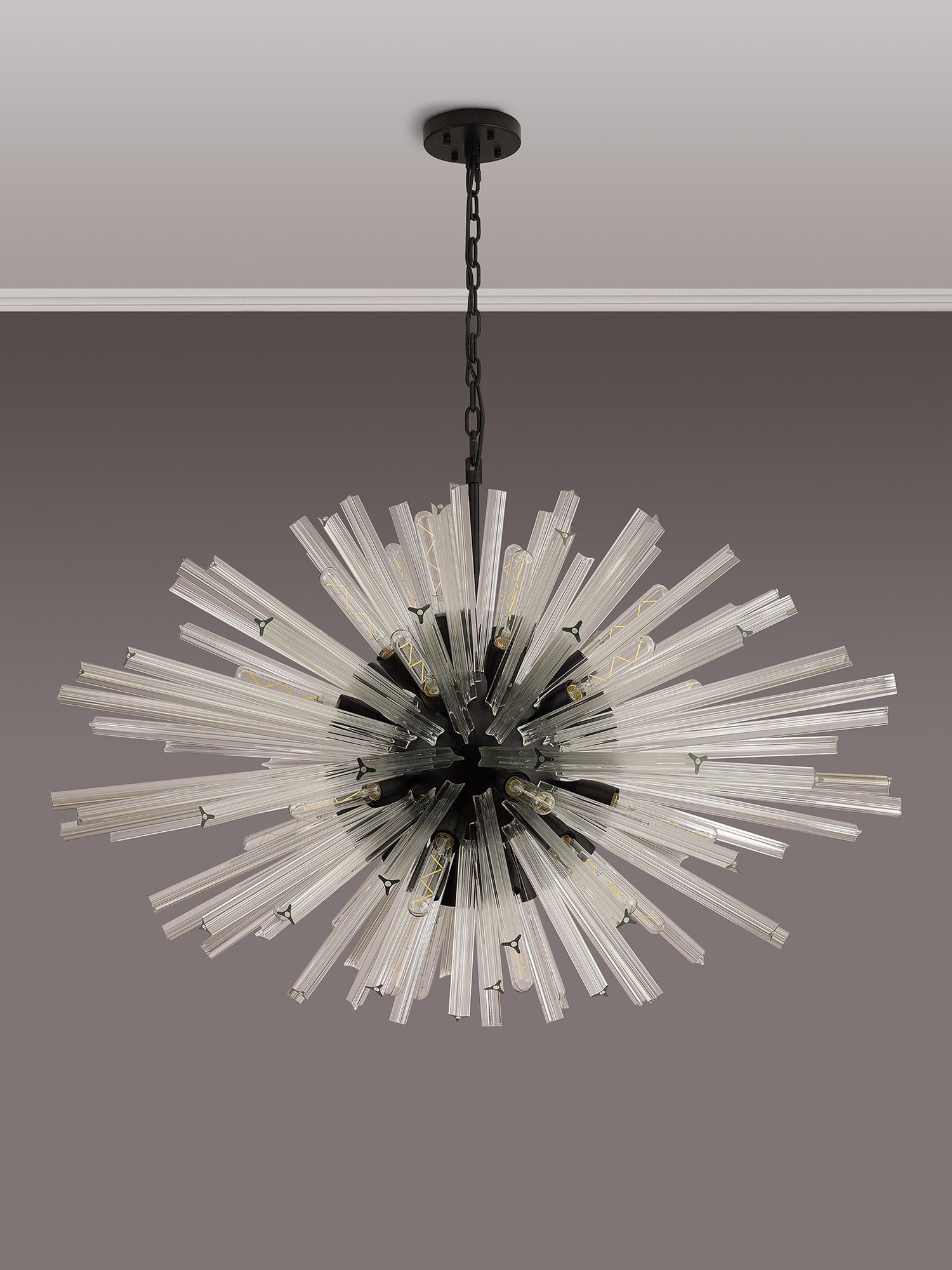 The Harris collection presents an intriguing glass shape moulded into a three dimensional triquetra. The grooves along each sized glass create an appealing optical effect which is effortlessly enhanced with the use of tubular lamps. The wide variety of fixtures available in this range span from a 6 light semi flush to an impacting 32 light pendant. The complementing wall lamps available allow for further application built around the same lighting family. Each frame can be chosen with either a brown oxide, polished nickel or matt black frame with either clear, champagne gold or smoke glass.