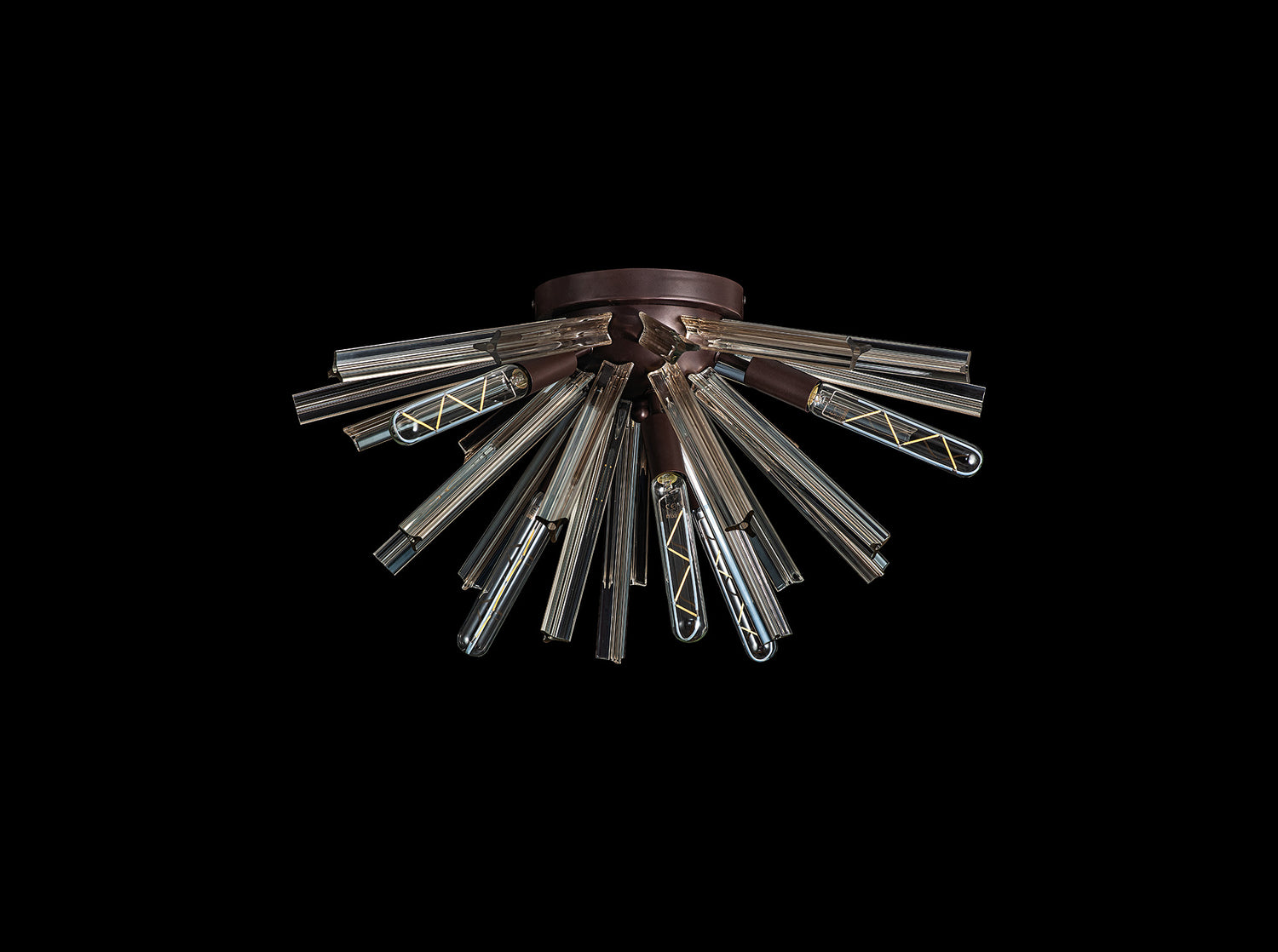 The Harris collection presents an intriguing glass shape moulded into a three dimensional triquetra. The grooves along each sized glass create an appealing optical effect which is effortlessly enhanced with the use of tubular lamps. The wide variety of fixtures available in this range span from a 6 light semi flush to an impacting 32 light pendant. The complementing wall lamps available allow for further application built around the same lighting family. Each frame can be chosen with either a brown oxide, polished nickel or matt black frame with either clear, champagne gold or smoke glass.