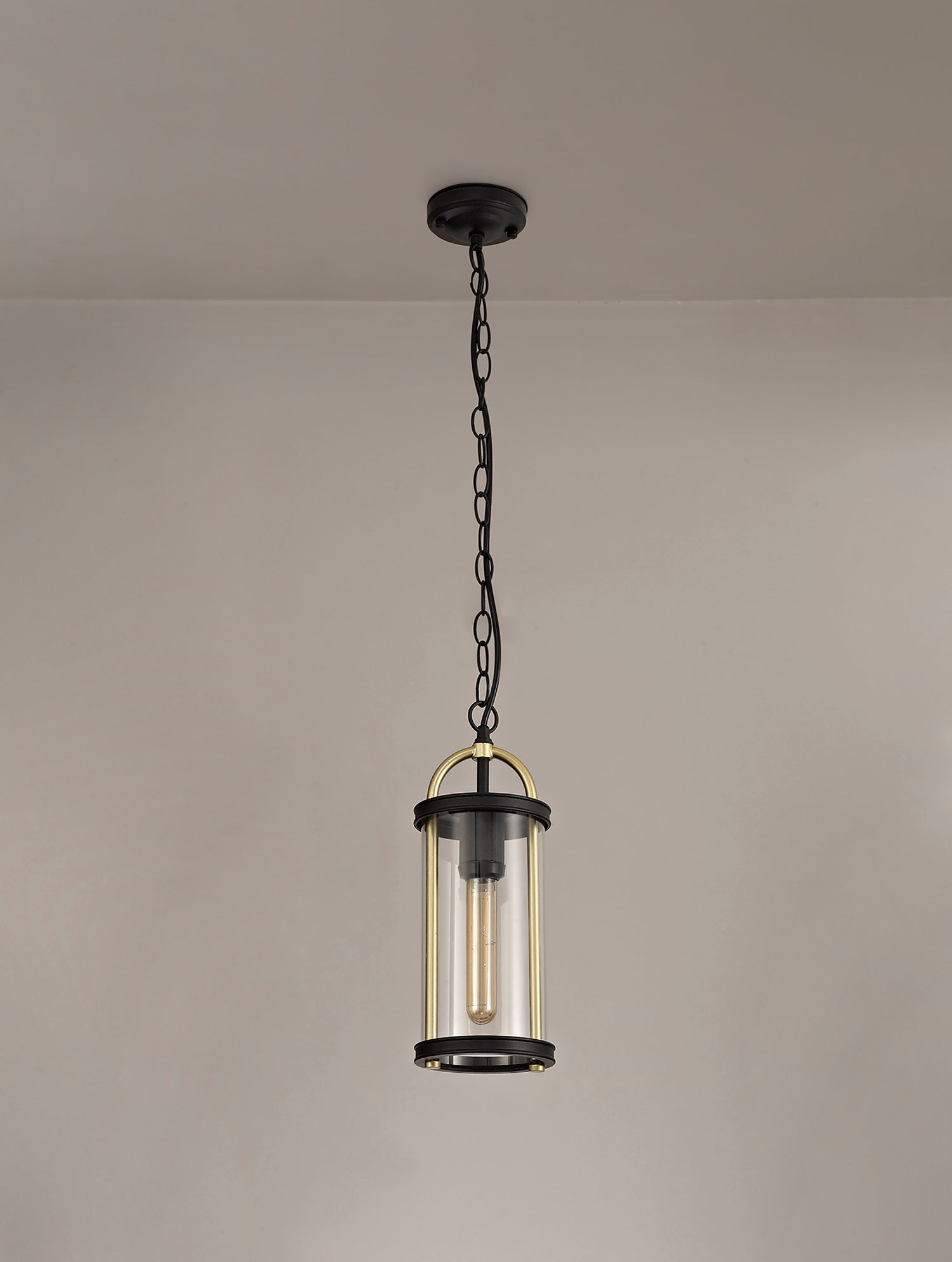 Hawke is another unique concept for your outdoor lighting needs, this collection of black cylindrical frames with clear glass panes are enhanced by the substantial gold metal arch that begins within the bottom of the frame and protrudes above the top of each fitting. On the small and large wall lamp this mimics a sort of handle effect whilst on the pendant fitting acts as a fixture to which the chain is held.