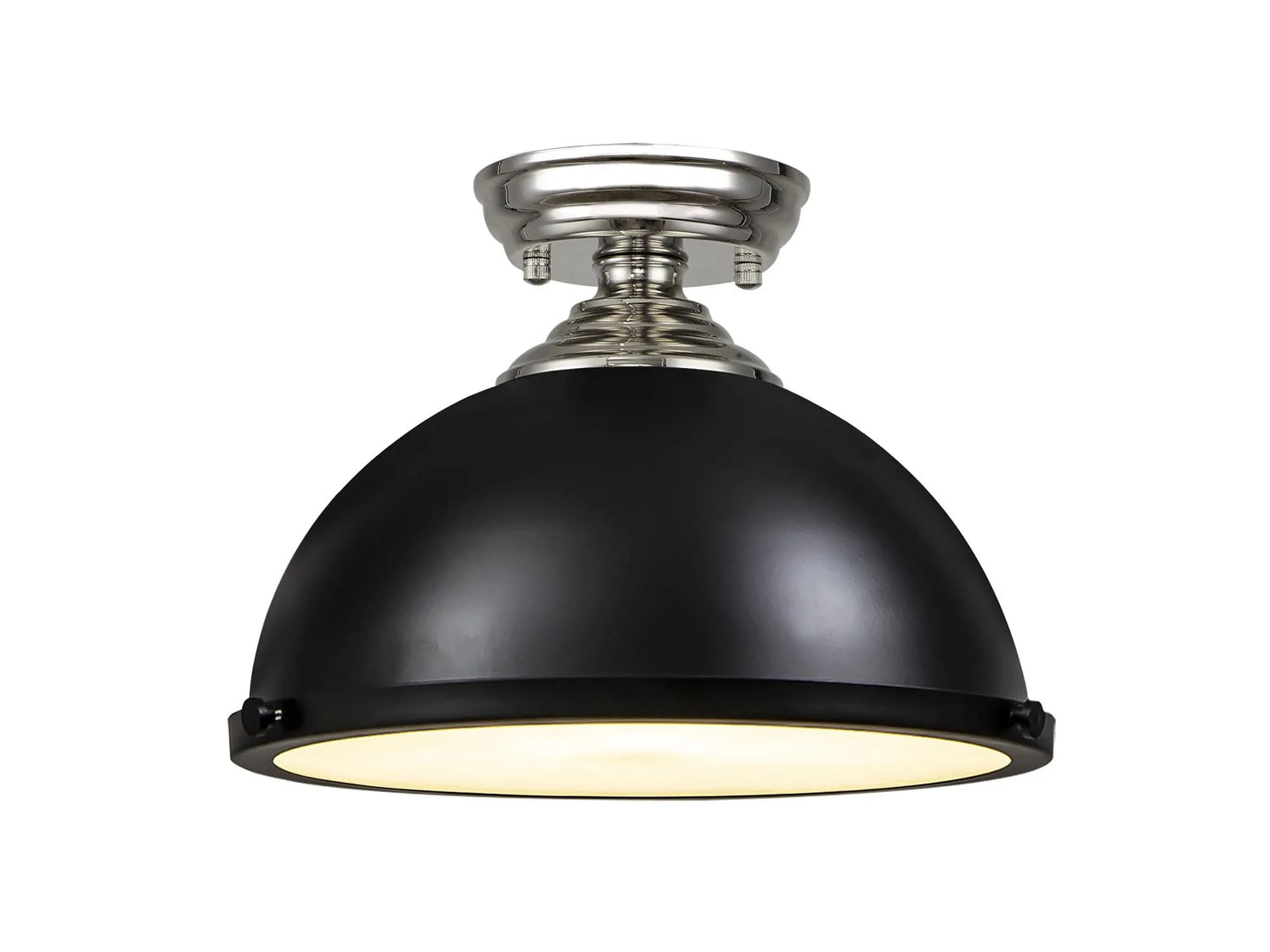 Holloway 1 Light Flush Ceiling E27 With Round 31cm Metal Shade Polished Nickel/Matt Black/Frosted White