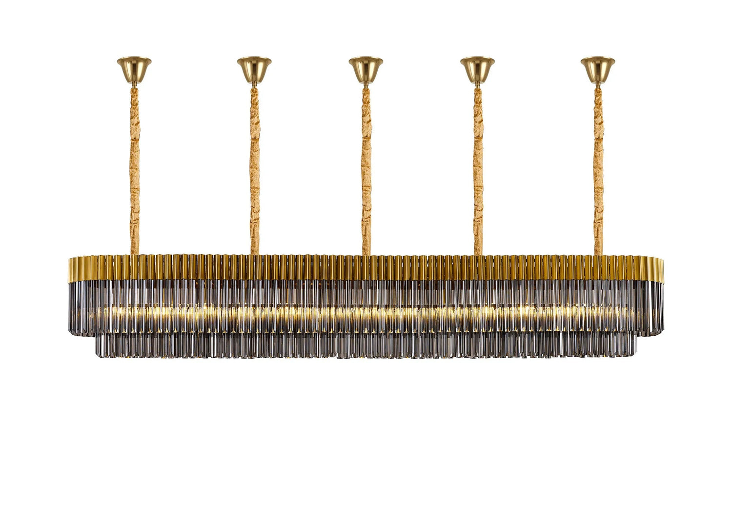 Longhorn 250 x 40cm Linear Pendant With Bell Cup, 13 Light E14, Brass/Smoked Sculpted Glass