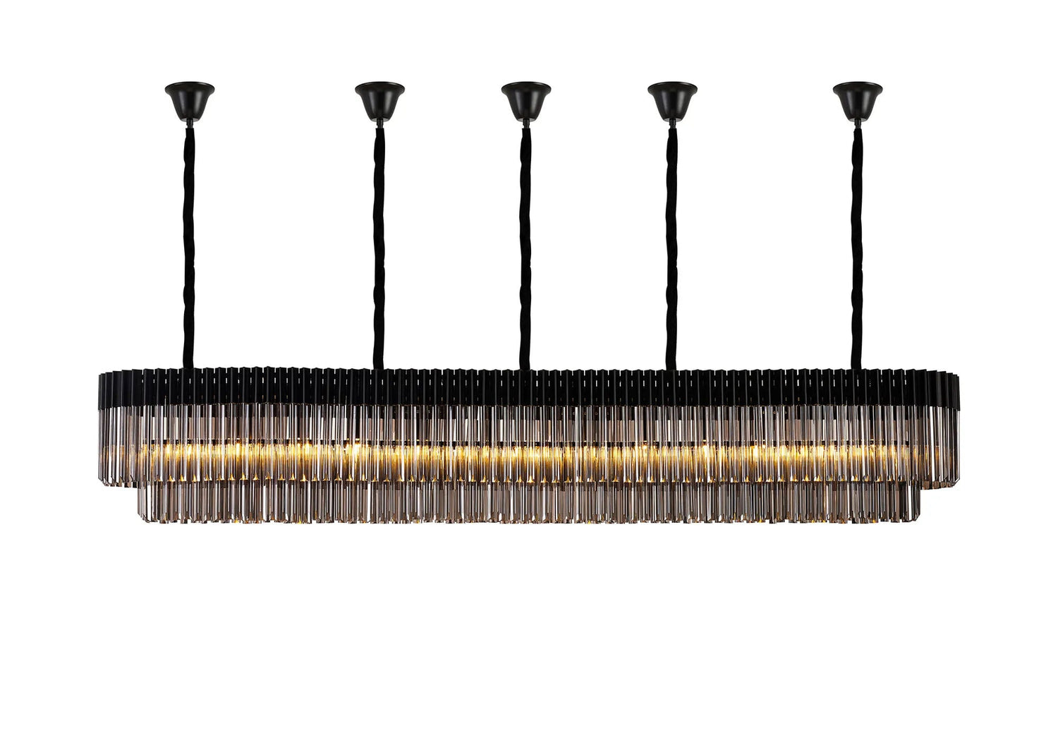 Longhorn 250 x 40cm Linear Pendant With Bell Cup, 13 Light E14, Matt Black/Smoked Sculpted Glass