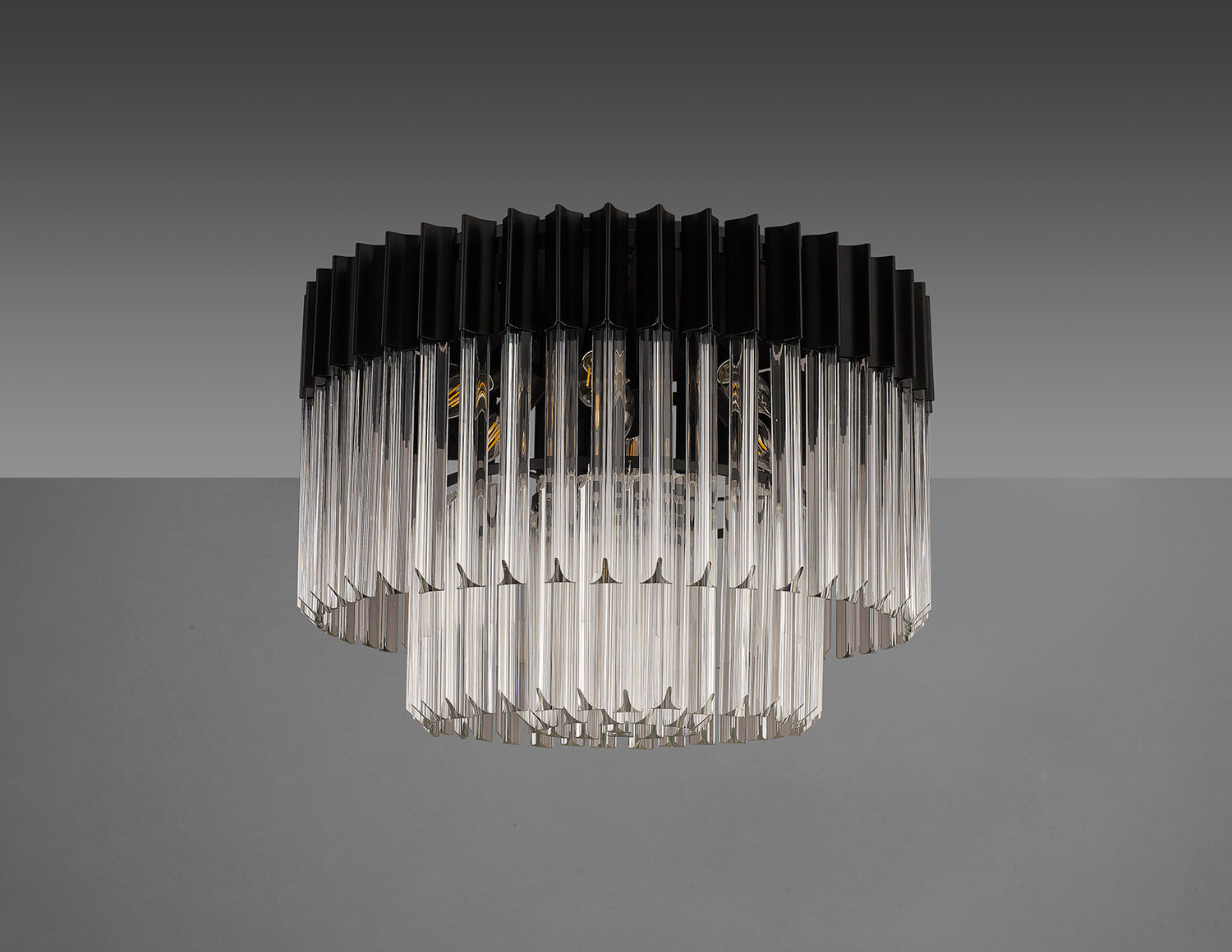 The popularity of the Longhorn collections initial release has been so overwhelming that the collection has now been extensively expanded to meet a wider range of specification needs. This contemporary design which originally combined a traditional brass finish with clear sculptured glass pieces, now offers a polished nickel or matt black finish with either clear, cognac or smoked glass. The long angular shape of the glass which are in a tiered form, can now be found on larger more dramatic designs including a five tier and rectangular pendant to name only a few. Longhorn has a traditional regal effect composed with modern materials to create a range suitable for either a modern or more traditional room setting. The unique pyramid forms protruding from the frame provide an intriguing overall shape across this comprehensive collection.