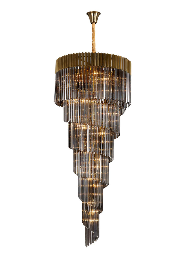 Longhorn 90cm Pendant Round 7 Layer Spiral 31 Light E14, Brass / Smoke Sculpted Glass, Item Weight: 93kg is backordered and will ship as soon as it is back in stock.