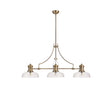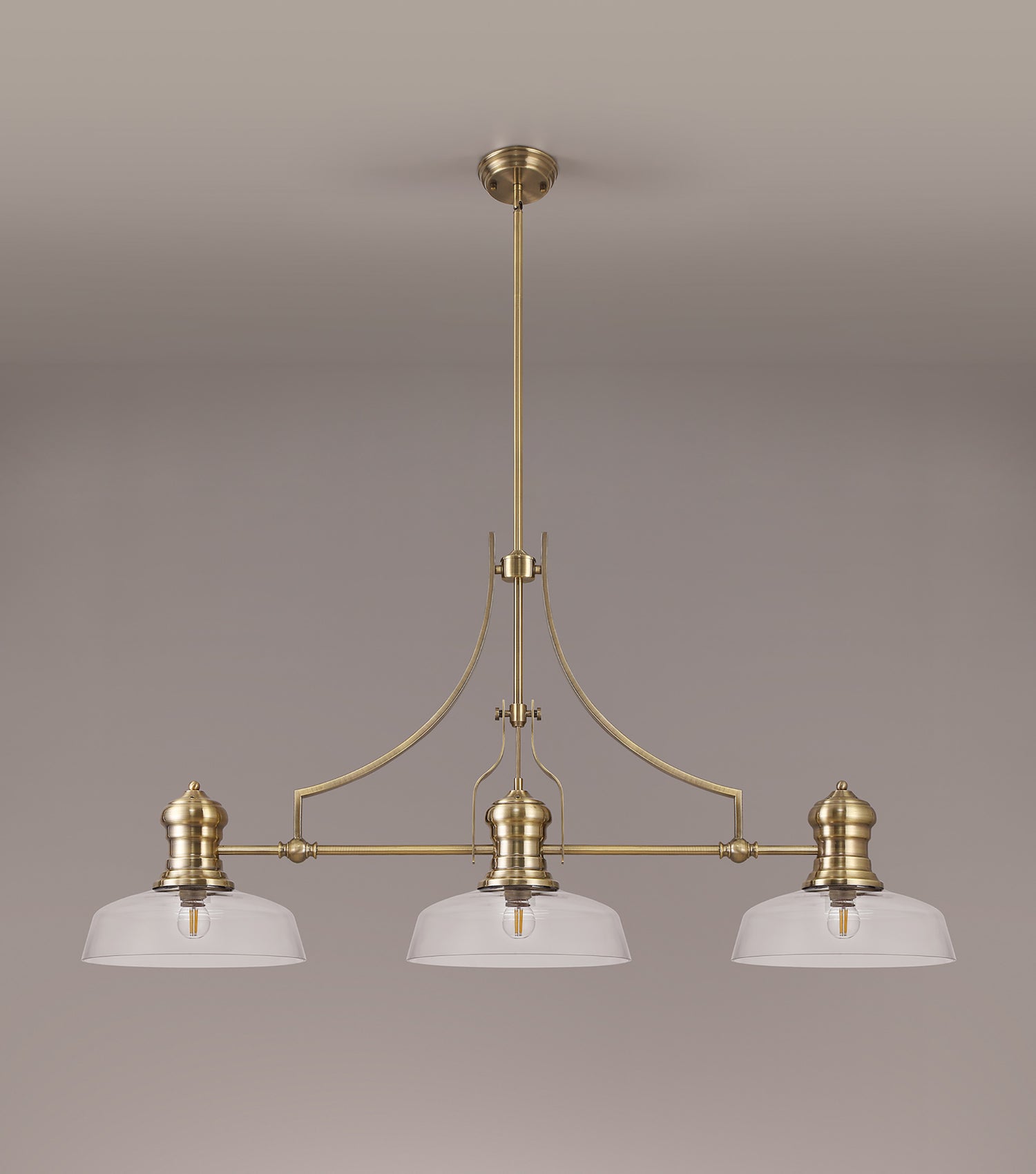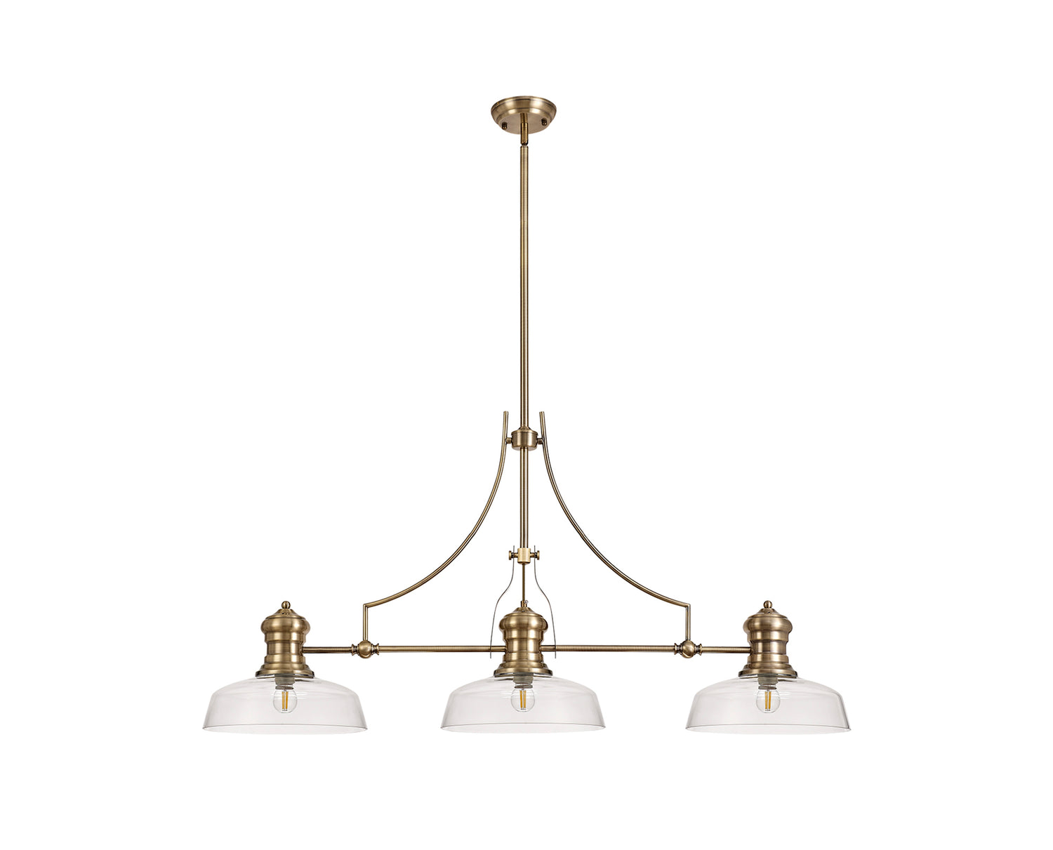 Munro 3 Light Linear Pendant E27 With 30cm Flat Round Glass Shade, Antique Brass, Clear