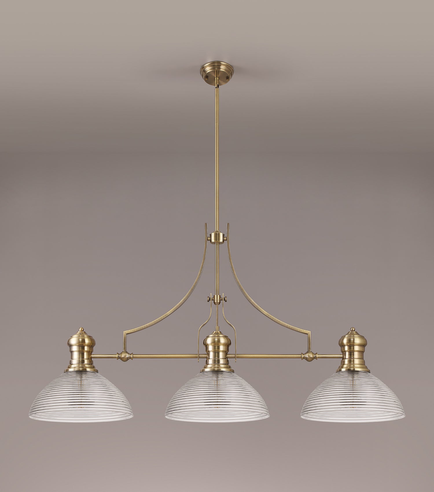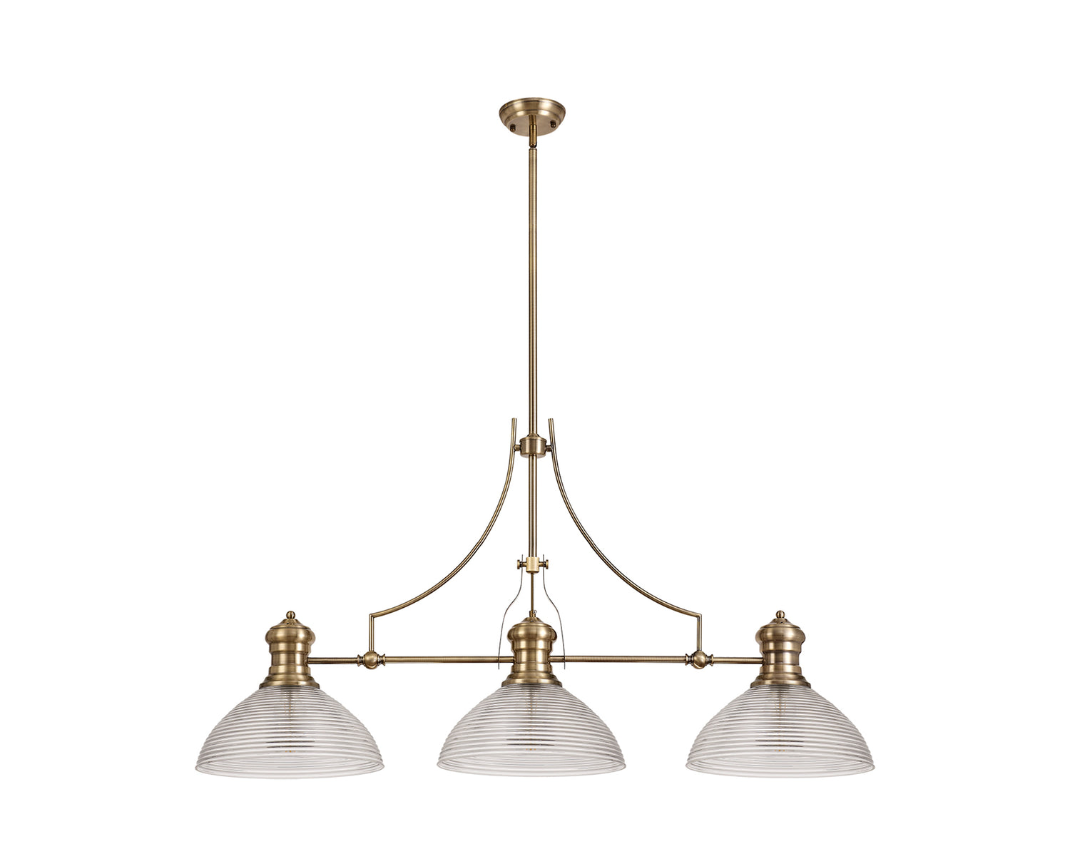 Munro 3 Light Linear Pendant E27 With 33.5cm Prismatic Glass Shade, Antique Brass, Clear