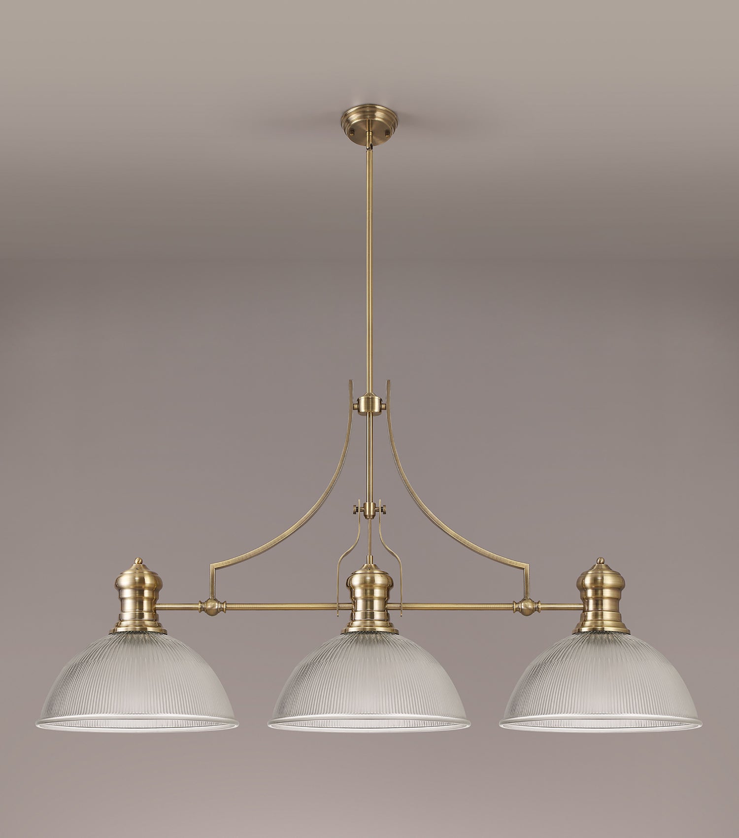 Munro 3 Light Linear Pendant E27 With 38cm Dome Glass Shade, Antique Brass, Clear
